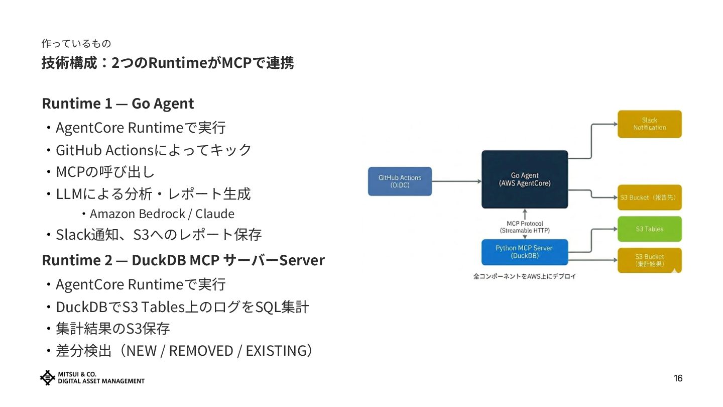 Actionsによってキック ‧MCPの呼び出し ‧LLMによる分析‧レポート⽣成 ‧Amazon Bedrock / Claude ‧Slack通知、S3へのレポート保存 Runtime 2 — DuckDB MCP サーバーServer ‧AgentCore Runtimeで実⾏ ‧DuckDBでS3 Tables上のログをSQL集計 ‧集計結果のS3保存 ‧差分検出(NEW / REMOVED / EXISTING) 16
