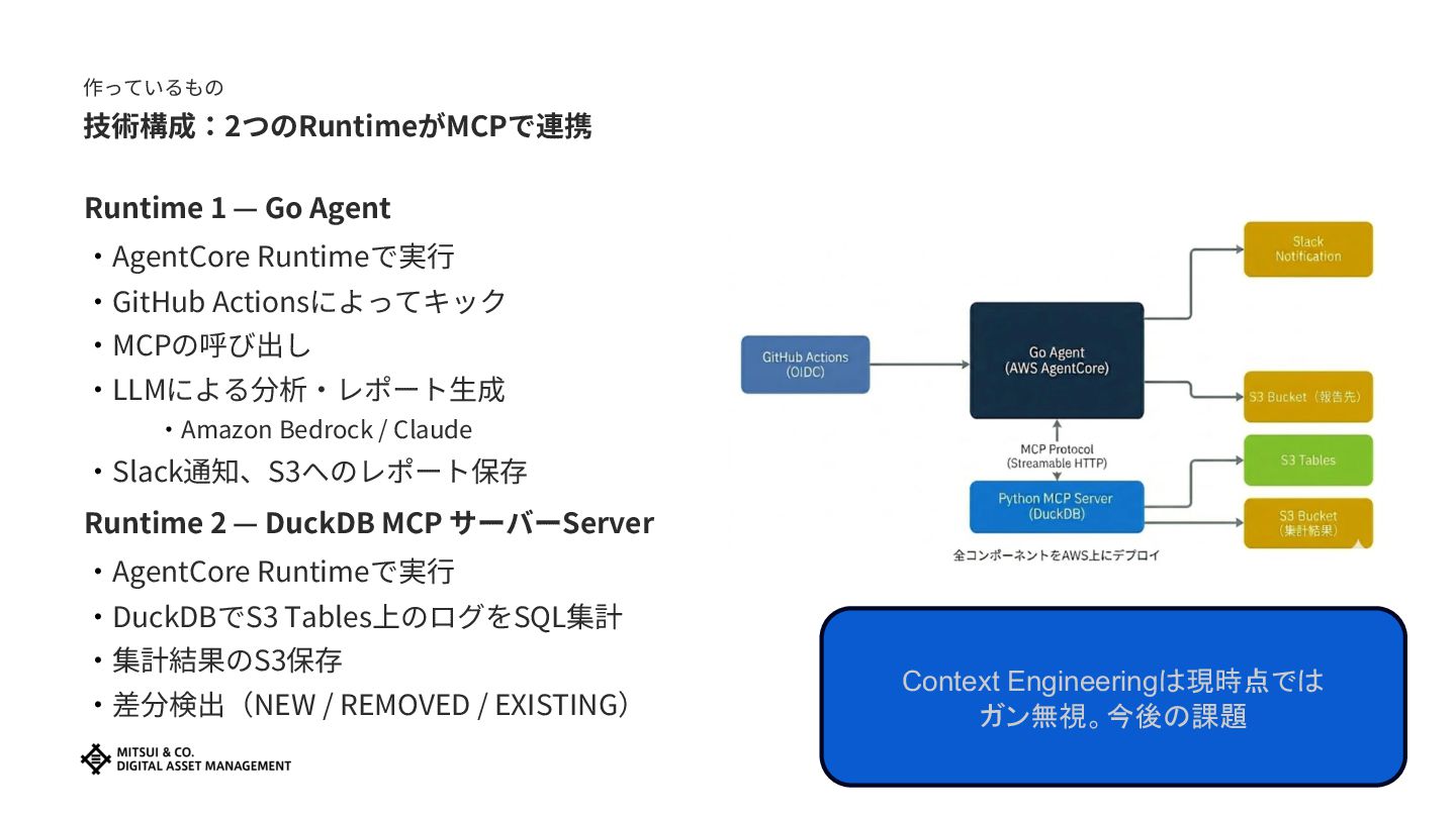 Actionsによってキック ‧MCPの呼び出し ‧LLMによる分析‧レポート⽣成 ‧Amazon Bedrock / Claude ‧Slack通知、S3へのレポート保存 Runtime 2 — DuckDB MCP サーバーServer ‧AgentCore Runtimeで実⾏ ‧DuckDBでS3 Tables上のログをSQL集計 ‧集計結果のS3保存 ‧差分検出(NEW / REMOVED / EXISTING) 17 Context Engineeringは現時点では ガン無視。今後の課題