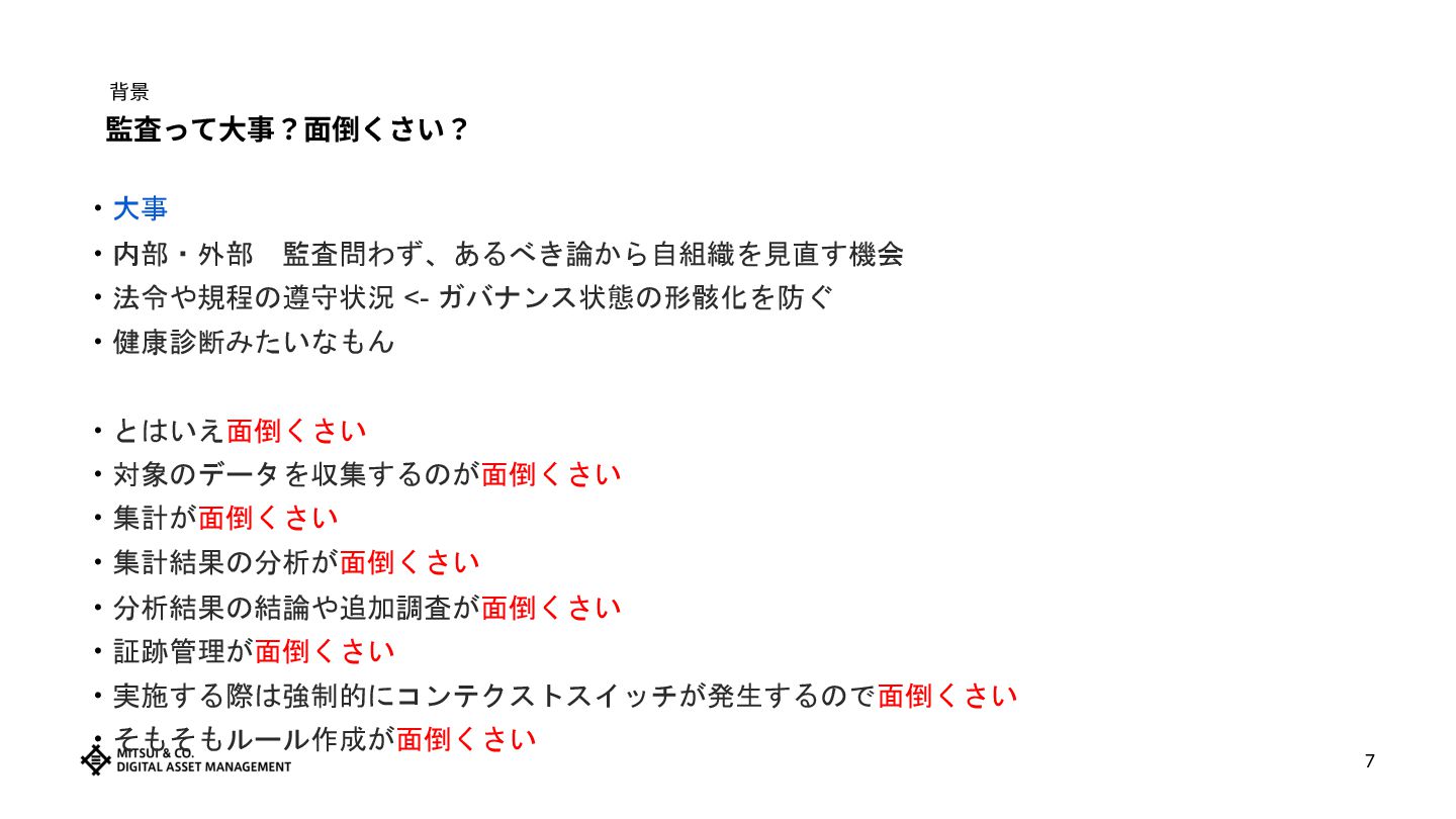 ‧とはいえ面倒くさい ‧対象のデータを収集するのが面倒くさい ‧集計が面倒くさい ‧集計結果の分析が面倒くさい ‧分析結果の結論や追加調査が面倒くさい ‧証跡管理が面倒くさい ‧実施する際は強制的にコンテクストスイッチが発生するので面倒くさい ‧そもそもルール作成が面倒くさい