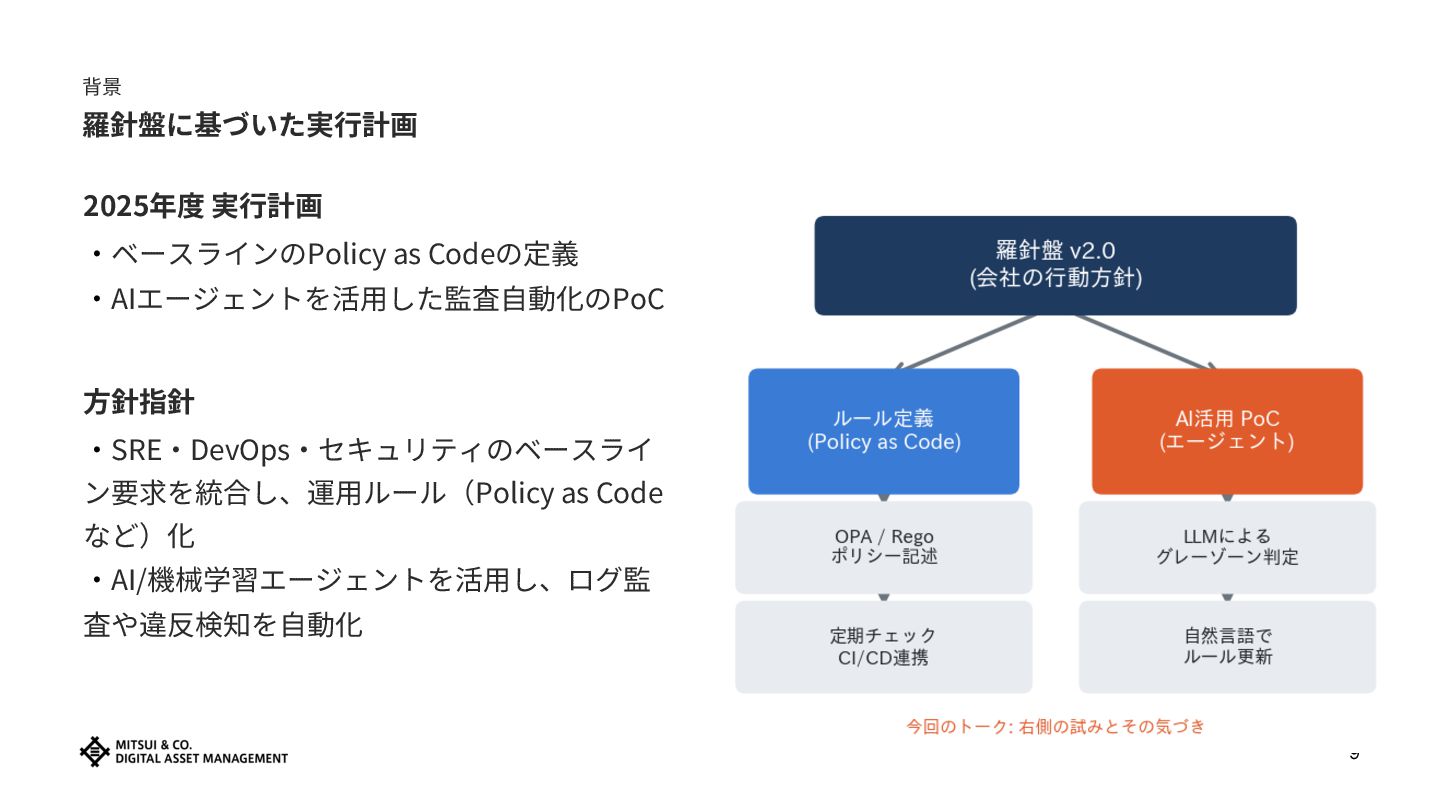 5. 背景 羅針盤に基づいた実⾏計画 2025年度 実⾏計画 ‧ベースラインのPolicy as Codeの定義 ‧AIエージェントを活⽤した監査⾃動化のPoC ⽅針指針 ‧SRE‧DevOps‧セキュリティのベースライ