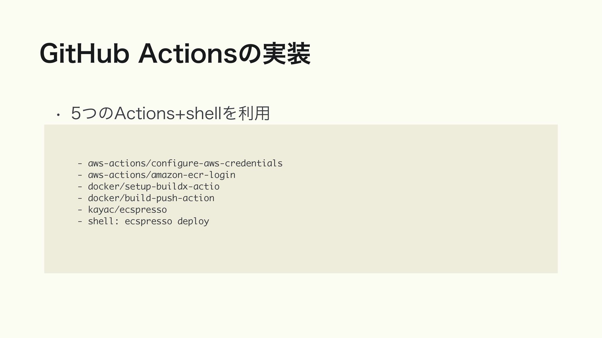 - aws-actions/configure-aws-credentials - aws-actions/amazon-ecr-login - docker/setup-buildx-actio - docker/build-push-action - kayac/ecspresso