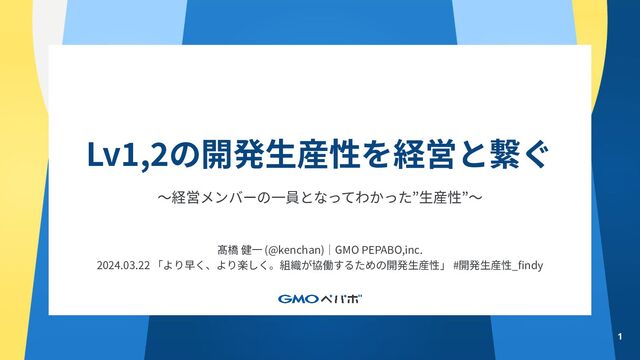 1 Lv1,2の開発⽣産性を経営と繋ぐ 〜経営メンバーの⼀員となってわかった”⽣産性”〜 髙橋 健⼀ (@kenchan)|GMO PEPABO,inc. 2024.03.22 「より早く、より楽しく。組織が協働するための開発⽣産性」 #開発⽣産性_findy