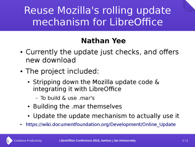 Reuse Mozilla's rolling update mechanism for LibreOffice Nathan Yee • Currently the update just checks, and offers new download • The project included: • Stripping down the Mozilla update code & integrating it with LibreOffice – To build & use .mar's • Building the .mar themselves • Update the update mechanism to actually use it • https://wiki.documentfoundation.org/Development/Online_Update