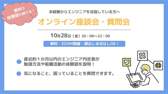 未経験からエンジニアを目指している方へ オンライン座談会・質問会 10月28日(金)20:00〜22:00 直近約1か月以内のエンジニア内定者が 勉強方法や転職活動の体験談を説明! 気になること、困っていることを質問できます。 無料・ZOOM開催・顔出し本名なしOK! 無料で 体験談が聞ける!