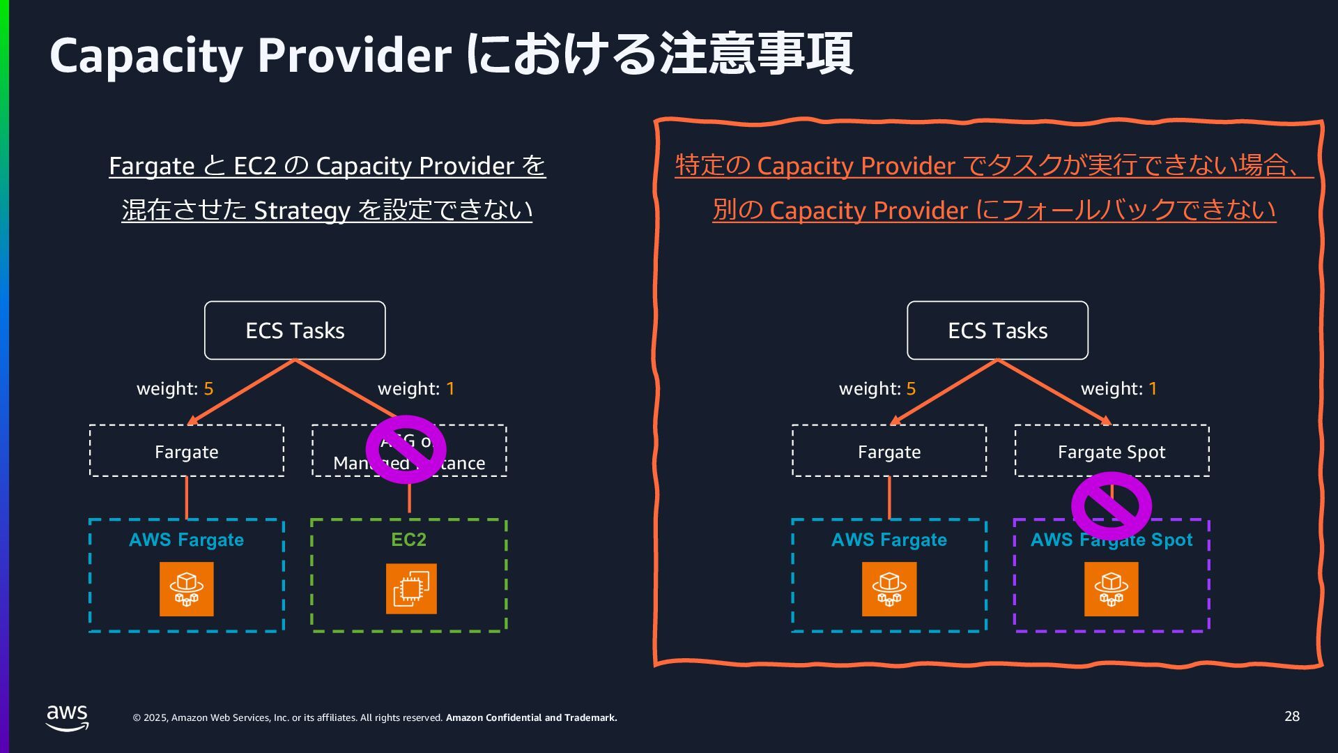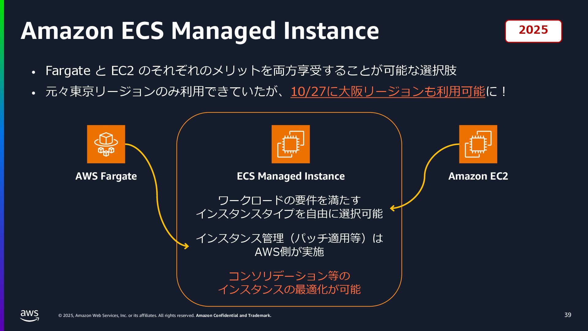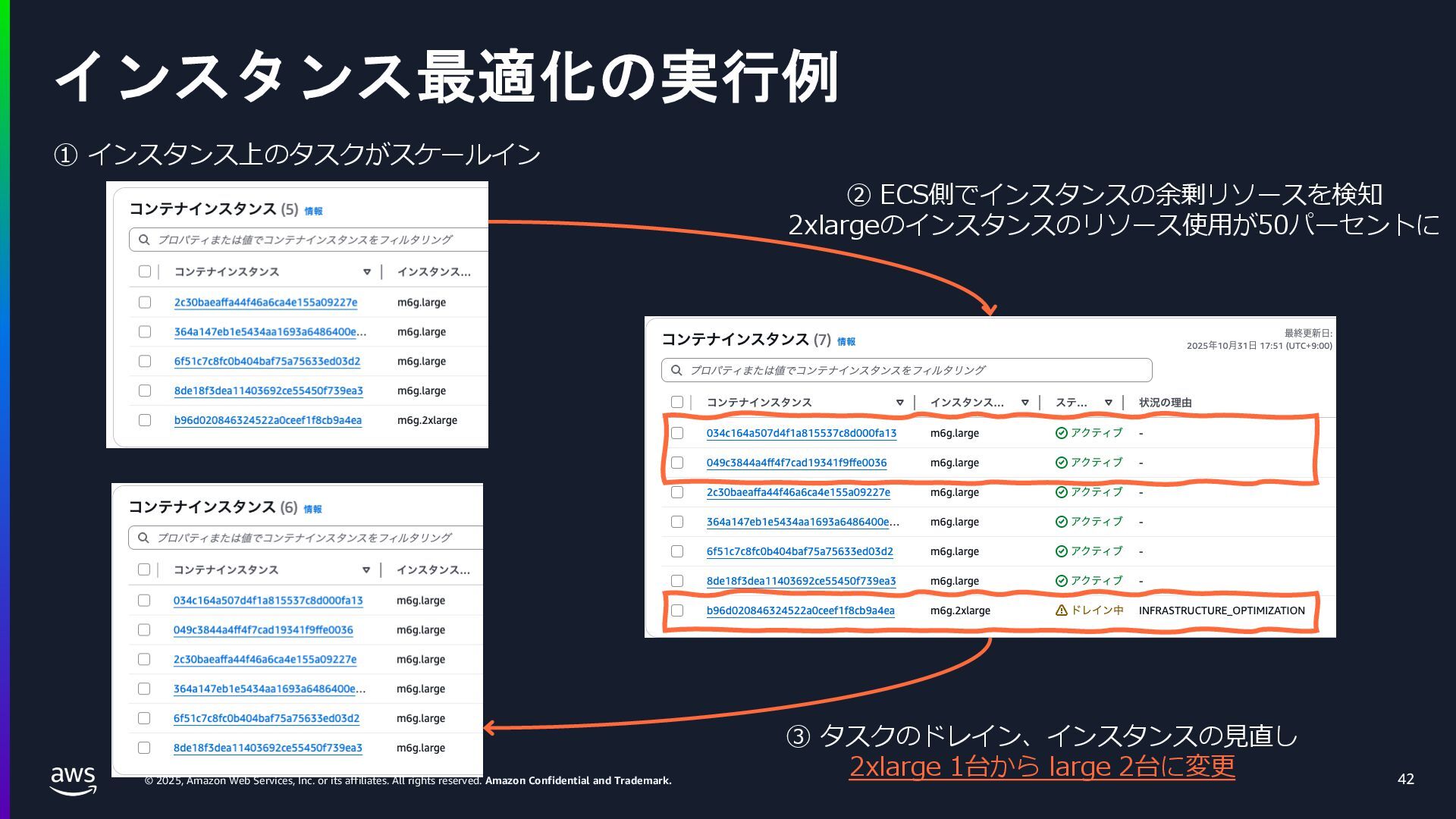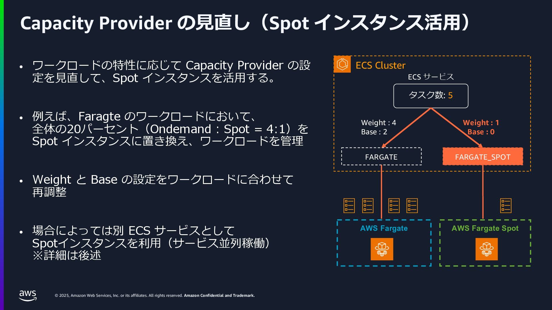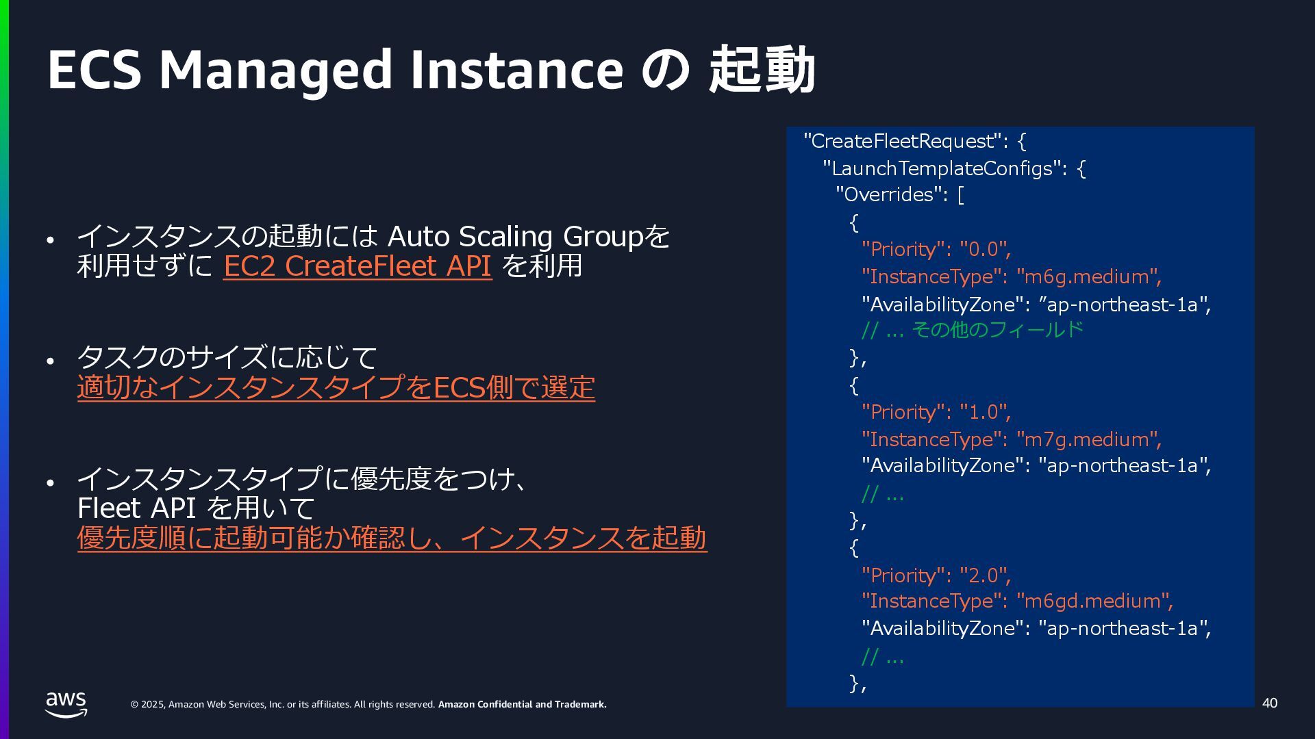 rights reserved. Amazon Confidential and Trademark. ECS Managed Instance の 起動 40 • インスタンスの起動には Auto Scaling Groupを 利⽤せずに EC2 CreateFleet API を利⽤ • タスクのサイズに応じて 適切なインスタンスタイプをECS側で選定 • インスタンスタイプに優先度をつけ、 Fleet API を⽤いて 優先度順に起動可能か確認し、インスタンスを起動 "CreateFleetRequest": { "LaunchTemplateConfigs": { "Overrides": [ { "Priority": "0.0", "InstanceType": "m6g.medium", "AvailabilityZone": ”ap-northeast-1a", // ... その他のフィールド }, { "Priority": "1.0", "InstanceType": "m7g.medium", "AvailabilityZone": "ap-northeast-1a", // ... }, { "Priority": "2.0", "InstanceType": "m6gd.medium", "AvailabilityZone": "ap-northeast-1a", // ... },