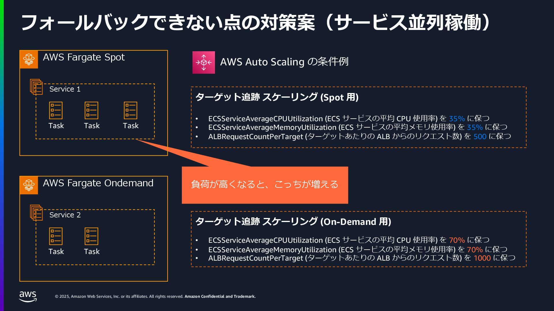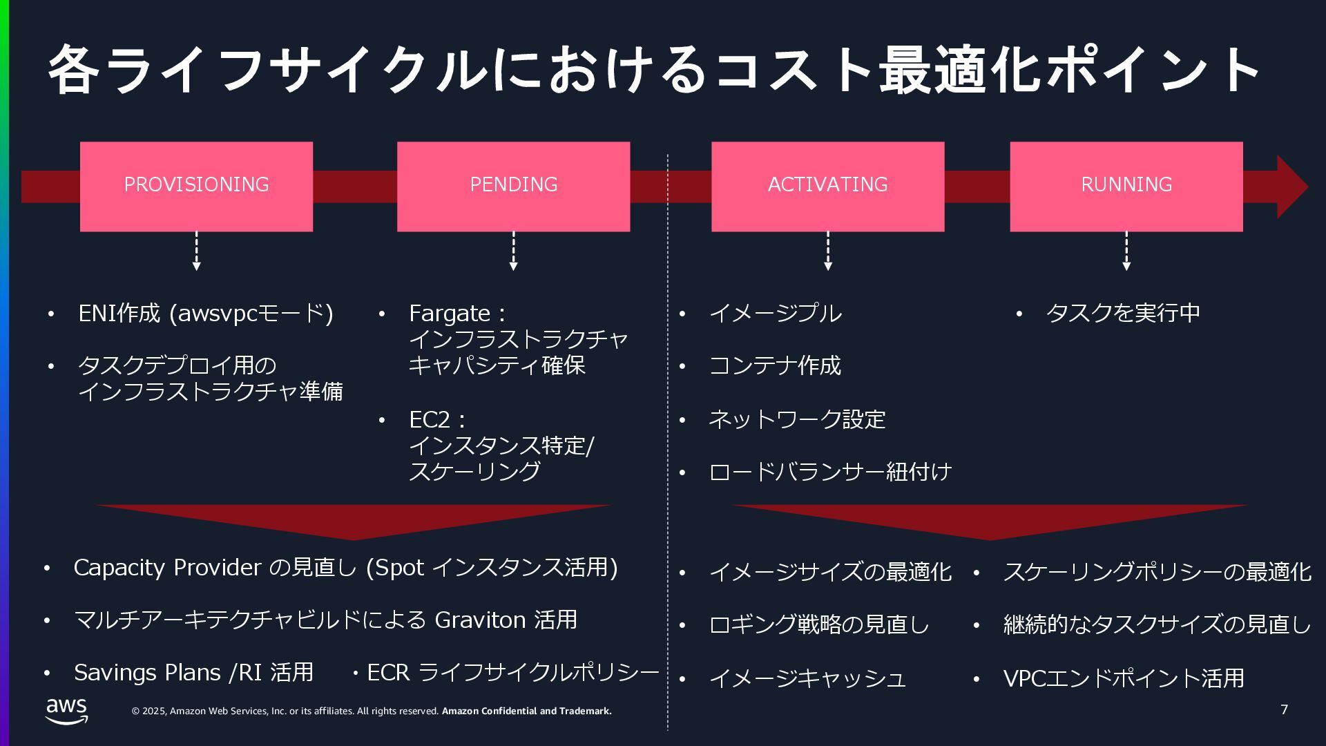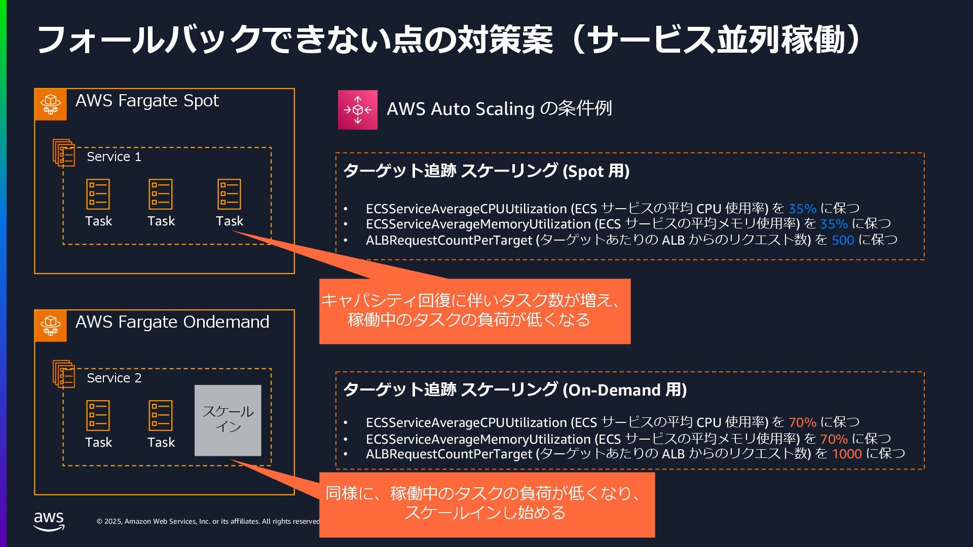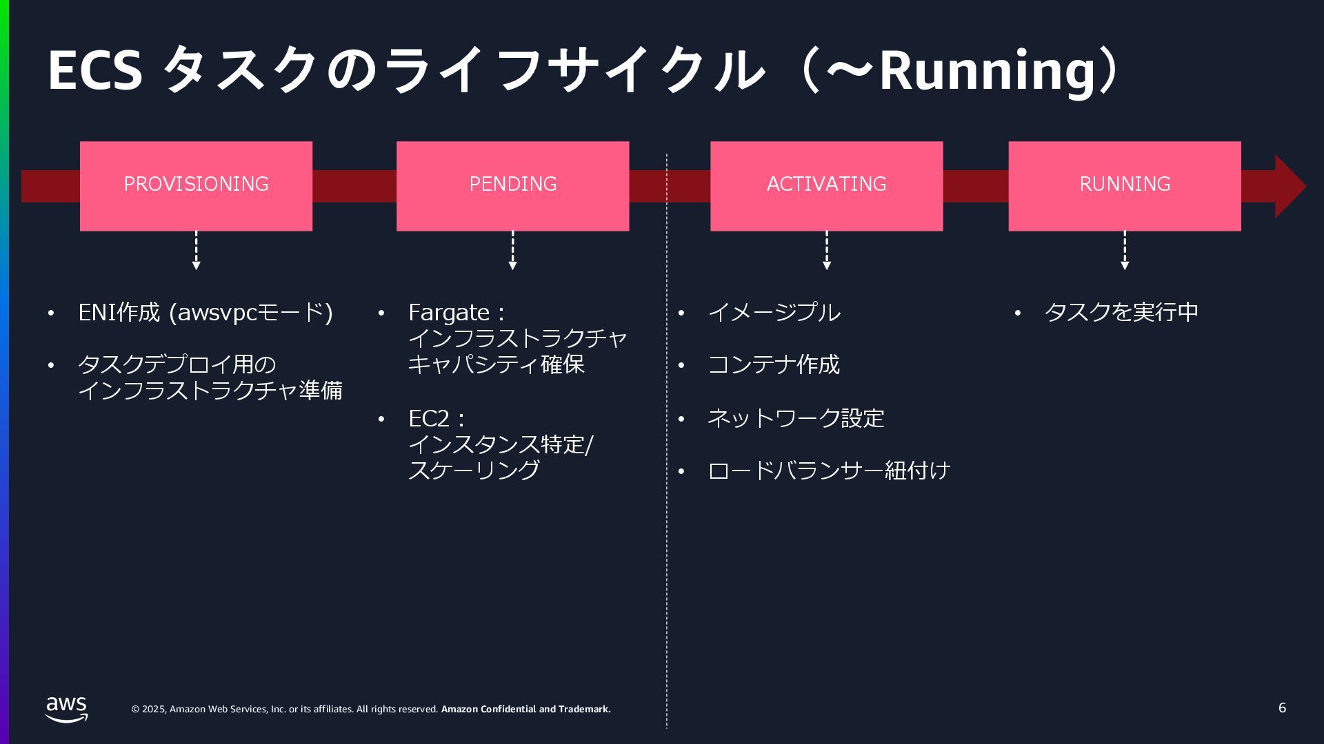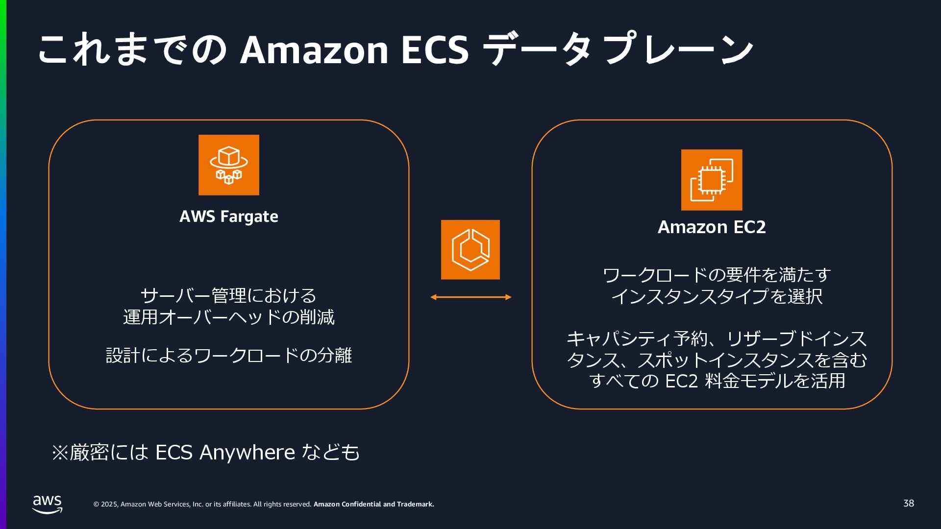 rights reserved. Amazon Confidential and Trademark. ECS Managed Instance の 起動 40 • インスタンスの起動には Auto Scaling Groupを 利⽤せずに EC2 CreateFleet API を利⽤ • タスクのサイズに応じて 適切なインスタンスタイプをECS側で選定 • インスタンスタイプに優先度をつけ、 Fleet API を⽤いて 優先度順に起動可能か確認し、インスタンスを起動 "CreateFleetRequest": { "LaunchTemplateConfigs": { "Overrides": [ { "Priority": "0.0", "InstanceType": "m6g.medium", "AvailabilityZone": ”ap-northeast-1a", // ... その他のフィールド }, { "Priority": "1.0", "InstanceType": "m7g.medium", "AvailabilityZone": "ap-northeast-1a", // ... }, { "Priority": "2.0", "InstanceType": "m6gd.medium", "AvailabilityZone": "ap-northeast-1a", // ... },