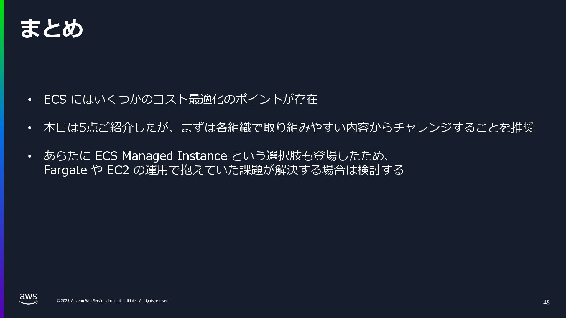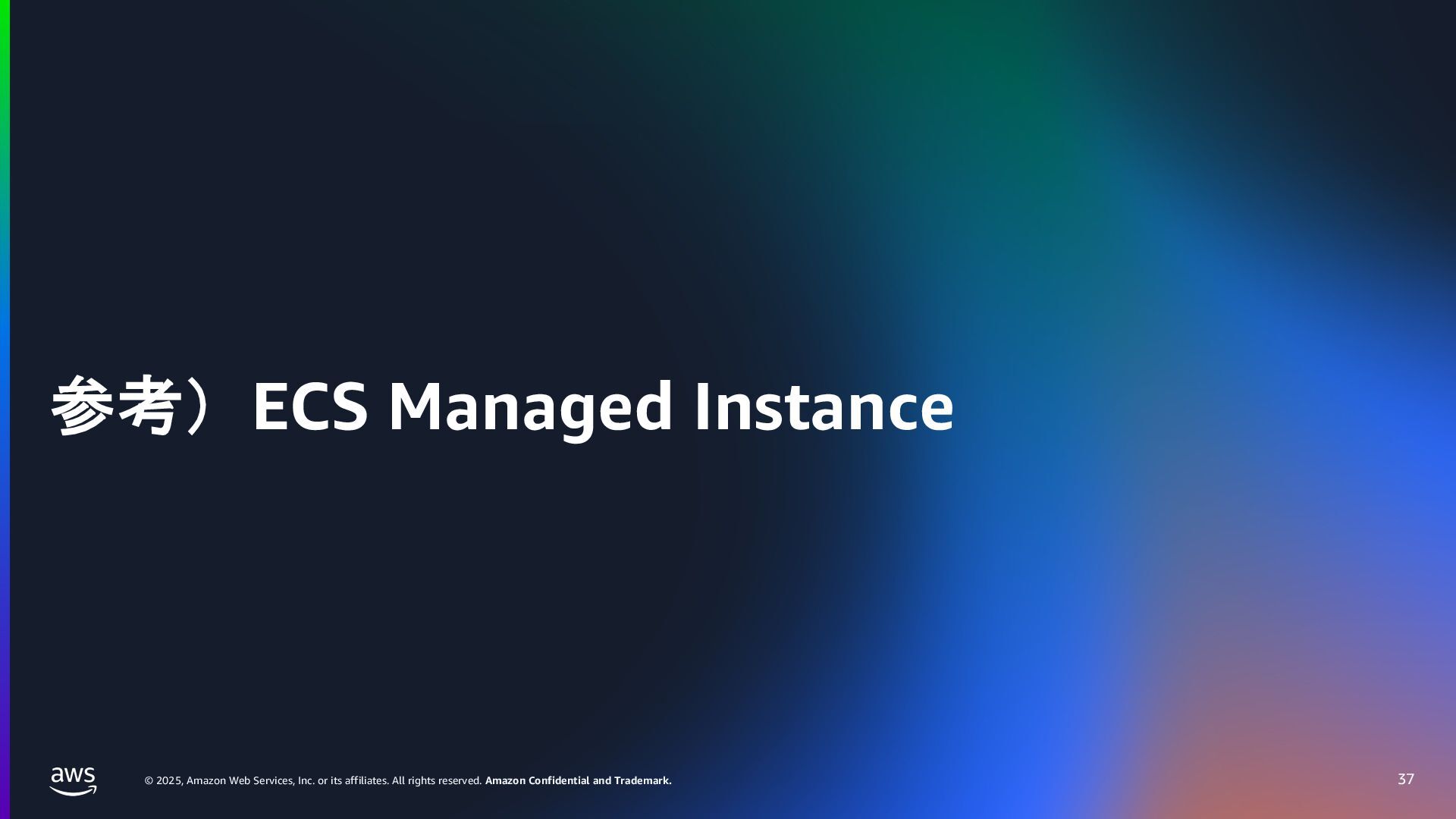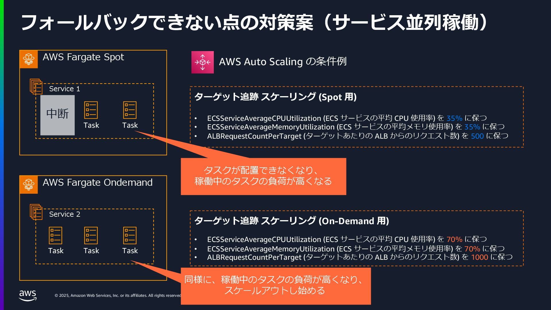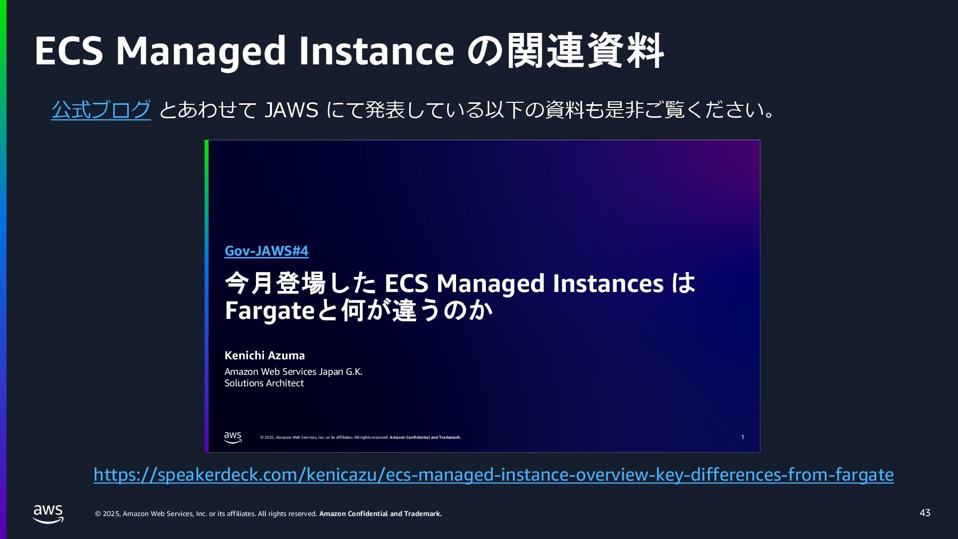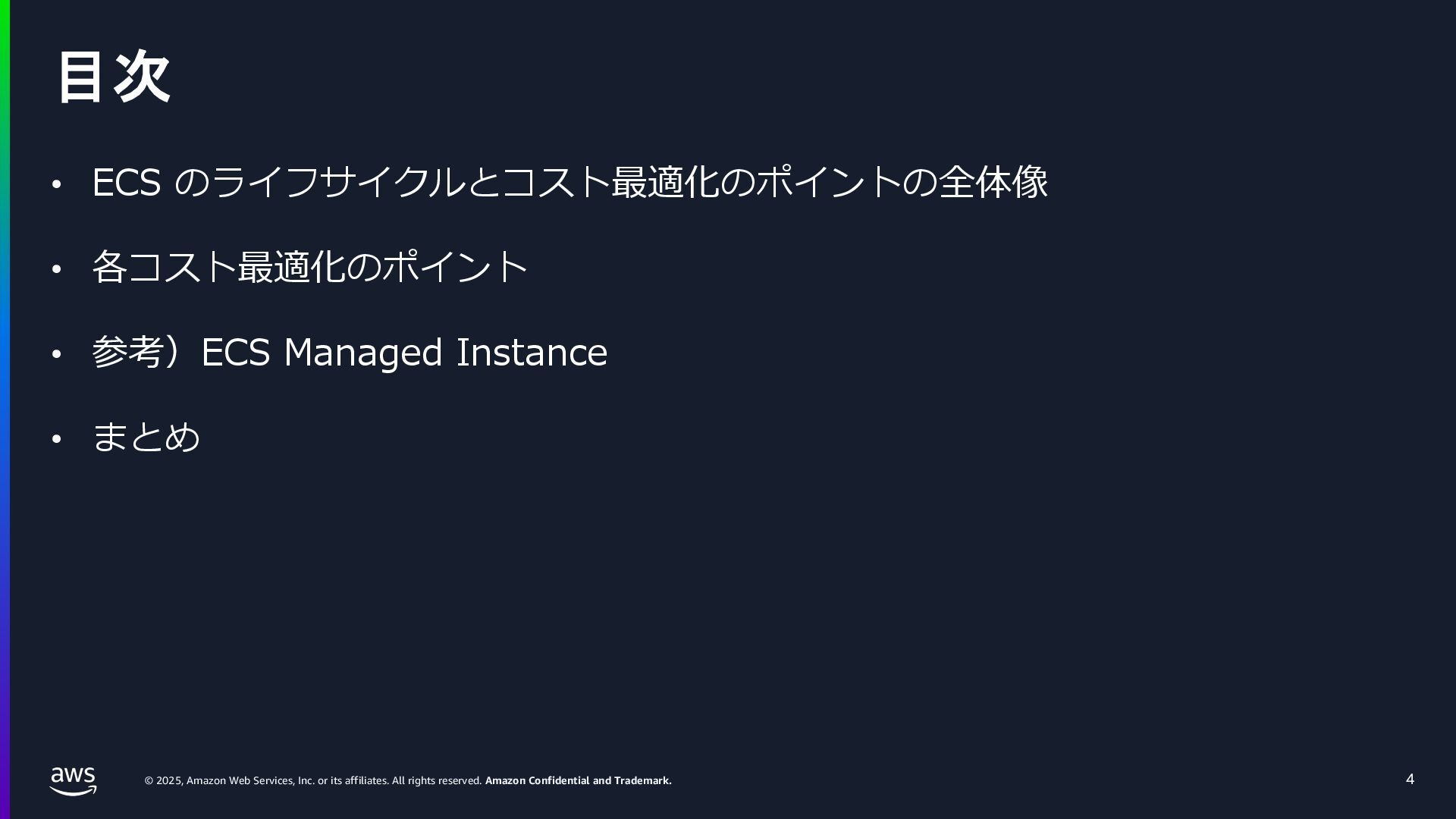 rights reserved. Amazon Confidential and Trademark. ECS Managed Instance の 起動 40 • インスタンスの起動には Auto Scaling Groupを 利⽤せずに EC2 CreateFleet API を利⽤ • タスクのサイズに応じて 適切なインスタンスタイプをECS側で選定 • インスタンスタイプに優先度をつけ、 Fleet API を⽤いて 優先度順に起動可能か確認し、インスタンスを起動 "CreateFleetRequest": { "LaunchTemplateConfigs": { "Overrides": [ { "Priority": "0.0", "InstanceType": "m6g.medium", "AvailabilityZone": ”ap-northeast-1a", // ... その他のフィールド }, { "Priority": "1.0", "InstanceType": "m7g.medium", "AvailabilityZone": "ap-northeast-1a", // ... }, { "Priority": "2.0", "InstanceType": "m6gd.medium", "AvailabilityZone": "ap-northeast-1a", // ... },