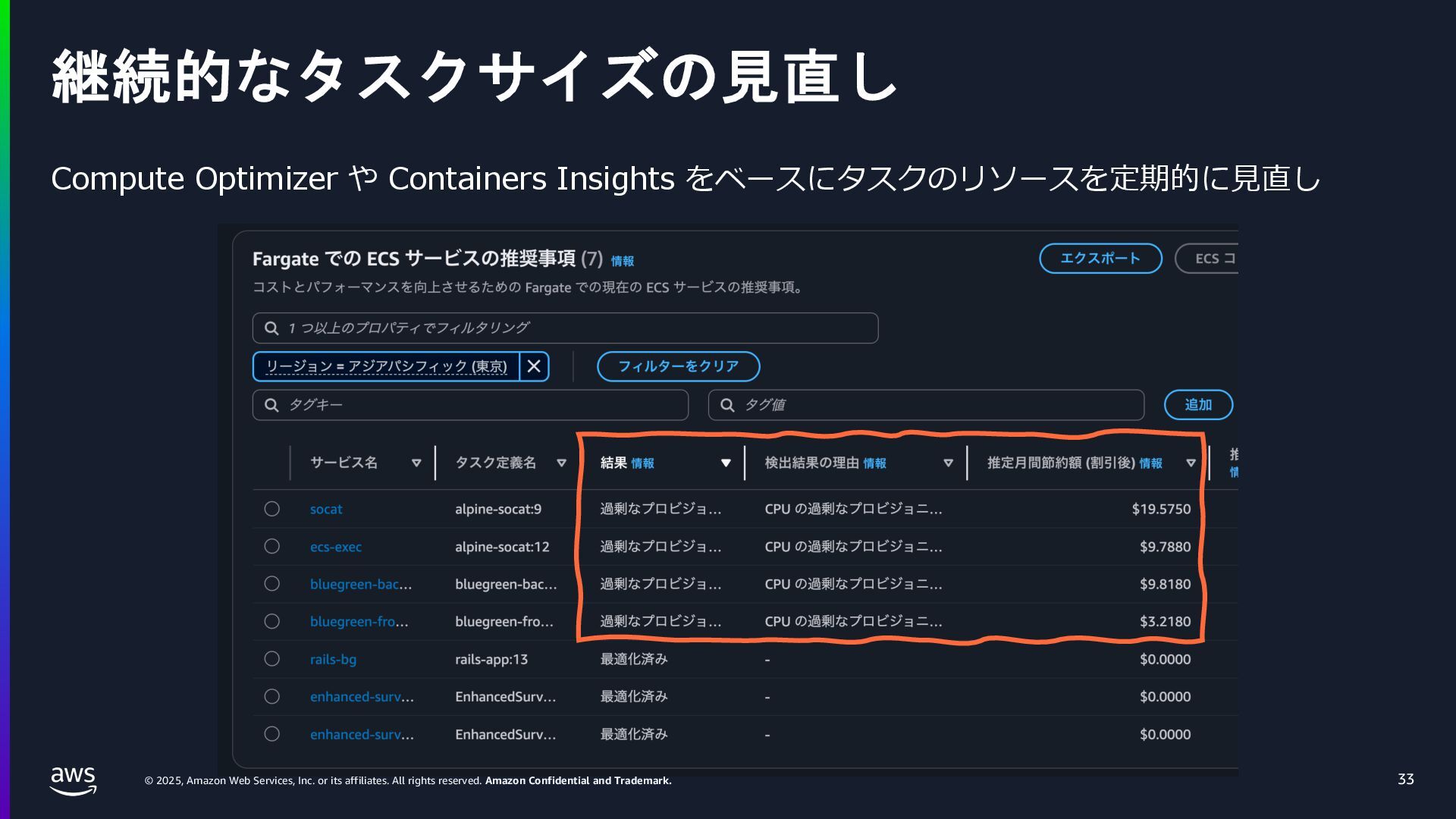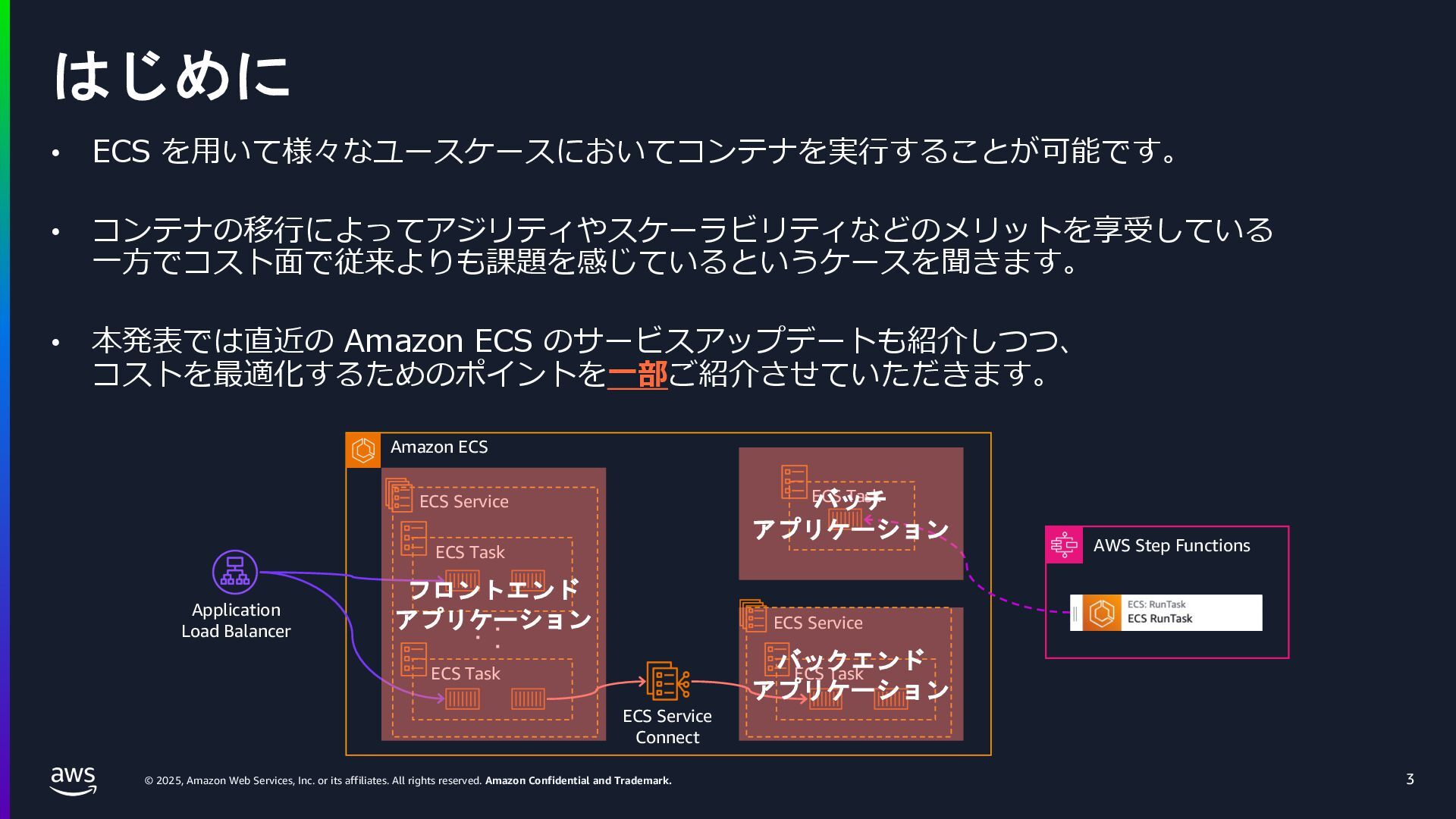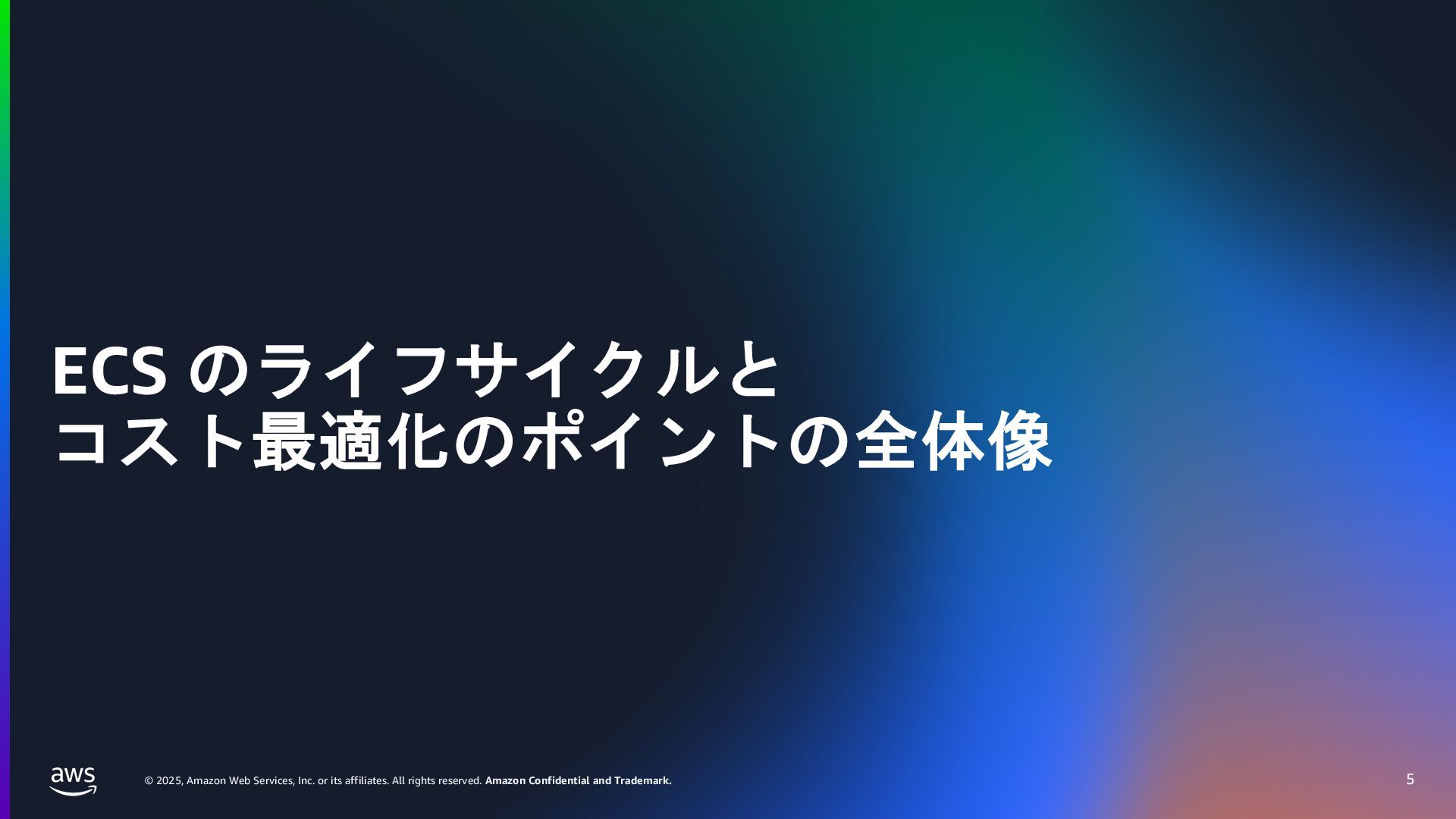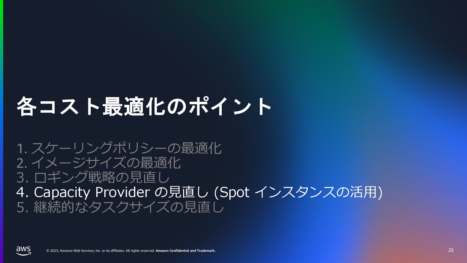 rights reserved. Amazon Confidential and Trademark. ECS Managed Instance の 起動 40 • インスタンスの起動には Auto Scaling Groupを 利⽤せずに EC2 CreateFleet API を利⽤ • タスクのサイズに応じて 適切なインスタンスタイプをECS側で選定 • インスタンスタイプに優先度をつけ、 Fleet API を⽤いて 優先度順に起動可能か確認し、インスタンスを起動 "CreateFleetRequest": { "LaunchTemplateConfigs": { "Overrides": [ { "Priority": "0.0", "InstanceType": "m6g.medium", "AvailabilityZone": ”ap-northeast-1a", // ... その他のフィールド }, { "Priority": "1.0", "InstanceType": "m7g.medium", "AvailabilityZone": "ap-northeast-1a", // ... }, { "Priority": "2.0", "InstanceType": "m6gd.medium", "AvailabilityZone": "ap-northeast-1a", // ... },