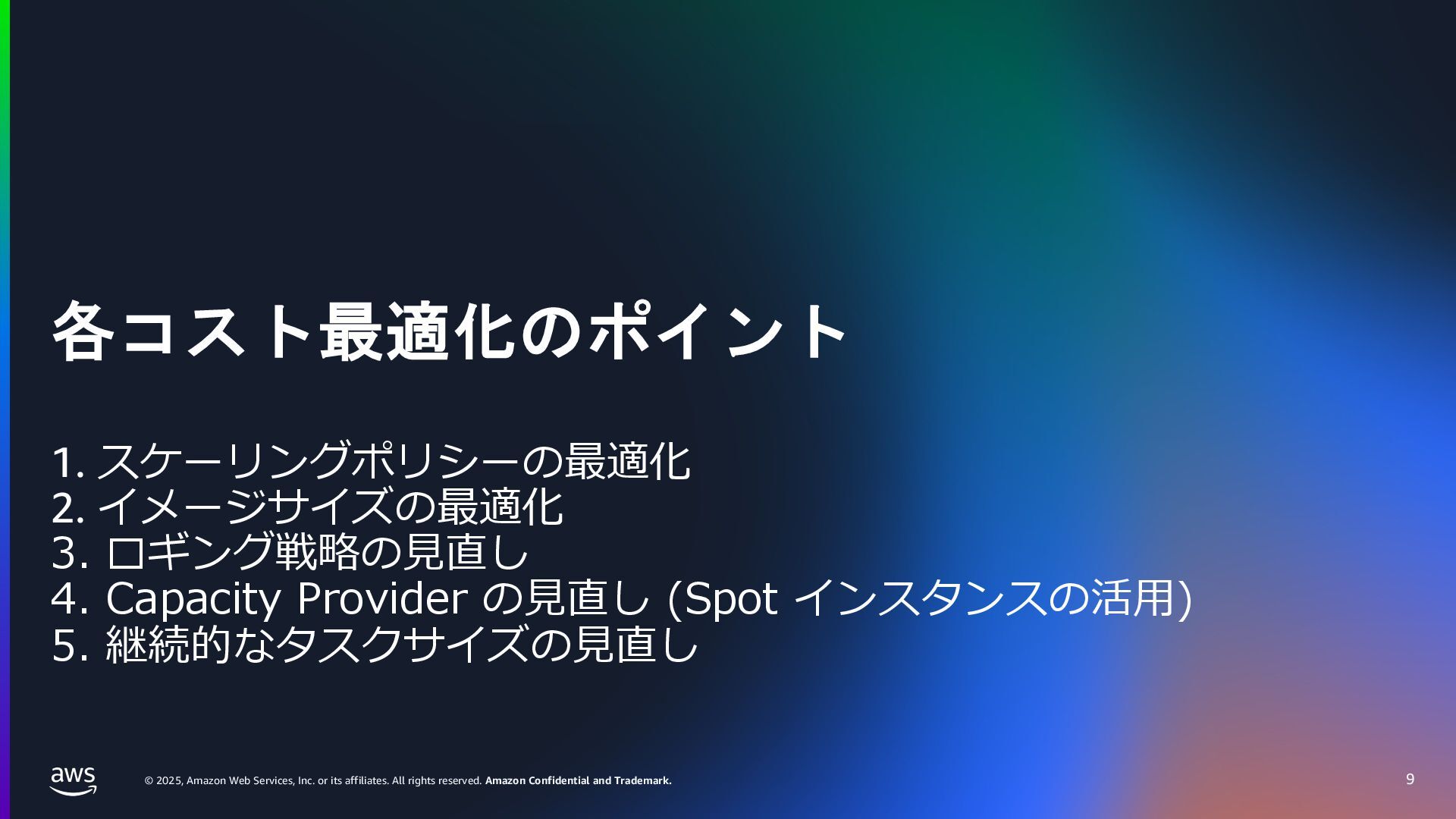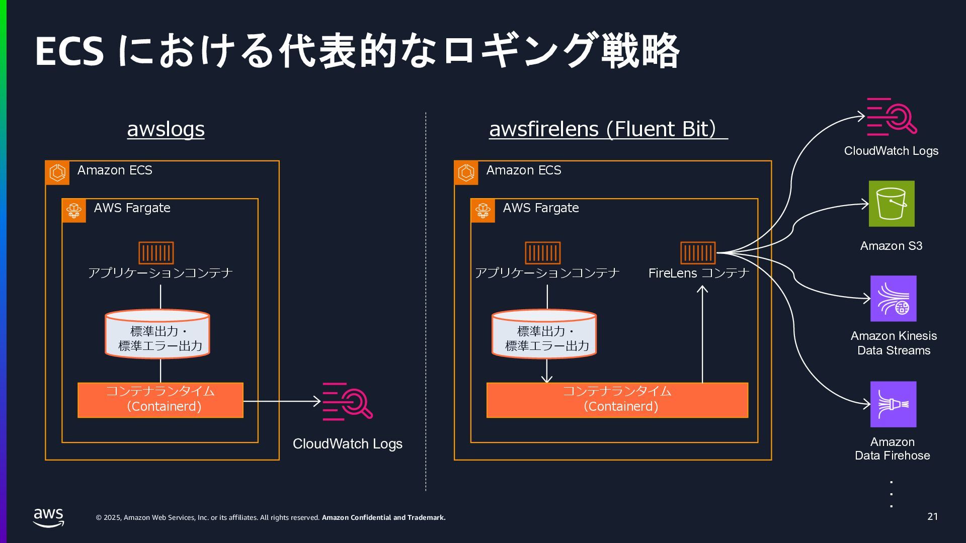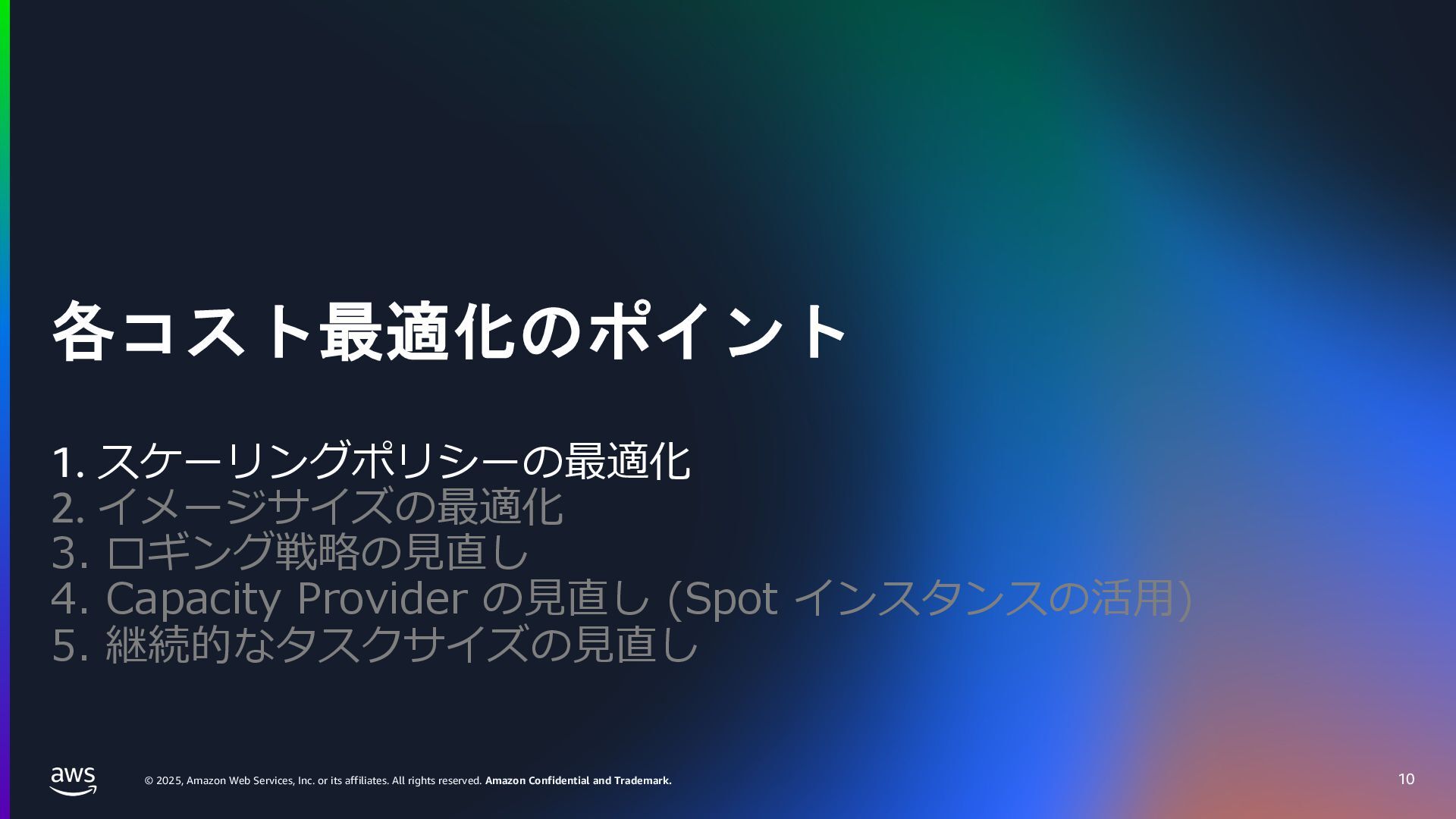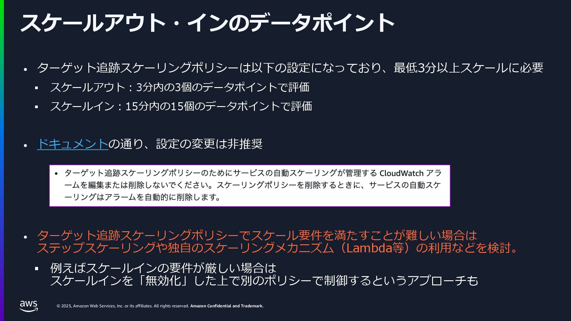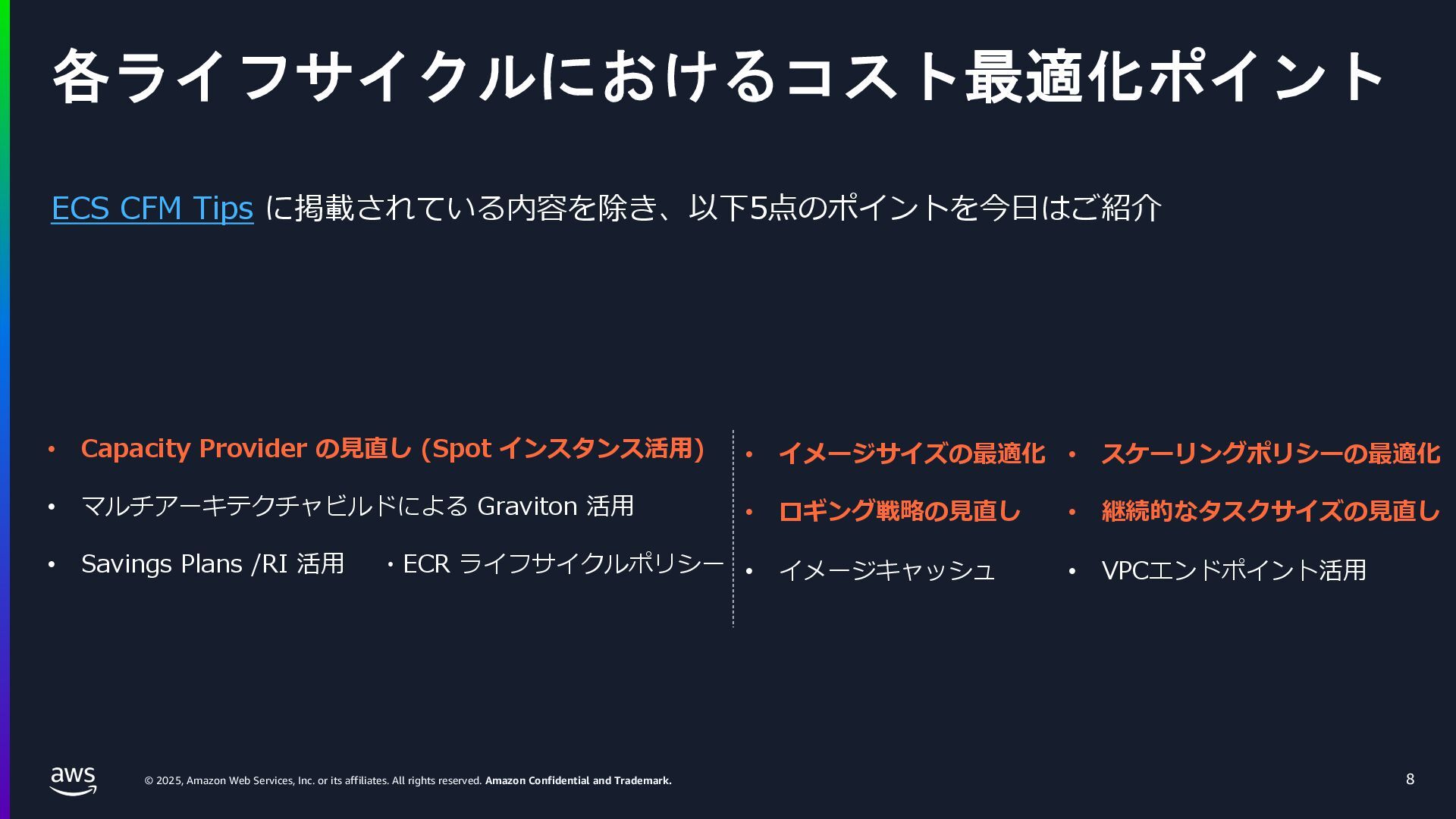rights reserved. Amazon Confidential and Trademark. ECS Managed Instance の 起動 40 • インスタンスの起動には Auto Scaling Groupを 利⽤せずに EC2 CreateFleet API を利⽤ • タスクのサイズに応じて 適切なインスタンスタイプをECS側で選定 • インスタンスタイプに優先度をつけ、 Fleet API を⽤いて 優先度順に起動可能か確認し、インスタンスを起動 "CreateFleetRequest": { "LaunchTemplateConfigs": { "Overrides": [ { "Priority": "0.0", "InstanceType": "m6g.medium", "AvailabilityZone": ”ap-northeast-1a", // ... その他のフィールド }, { "Priority": "1.0", "InstanceType": "m7g.medium", "AvailabilityZone": "ap-northeast-1a", // ... }, { "Priority": "2.0", "InstanceType": "m6gd.medium", "AvailabilityZone": "ap-northeast-1a", // ... },
