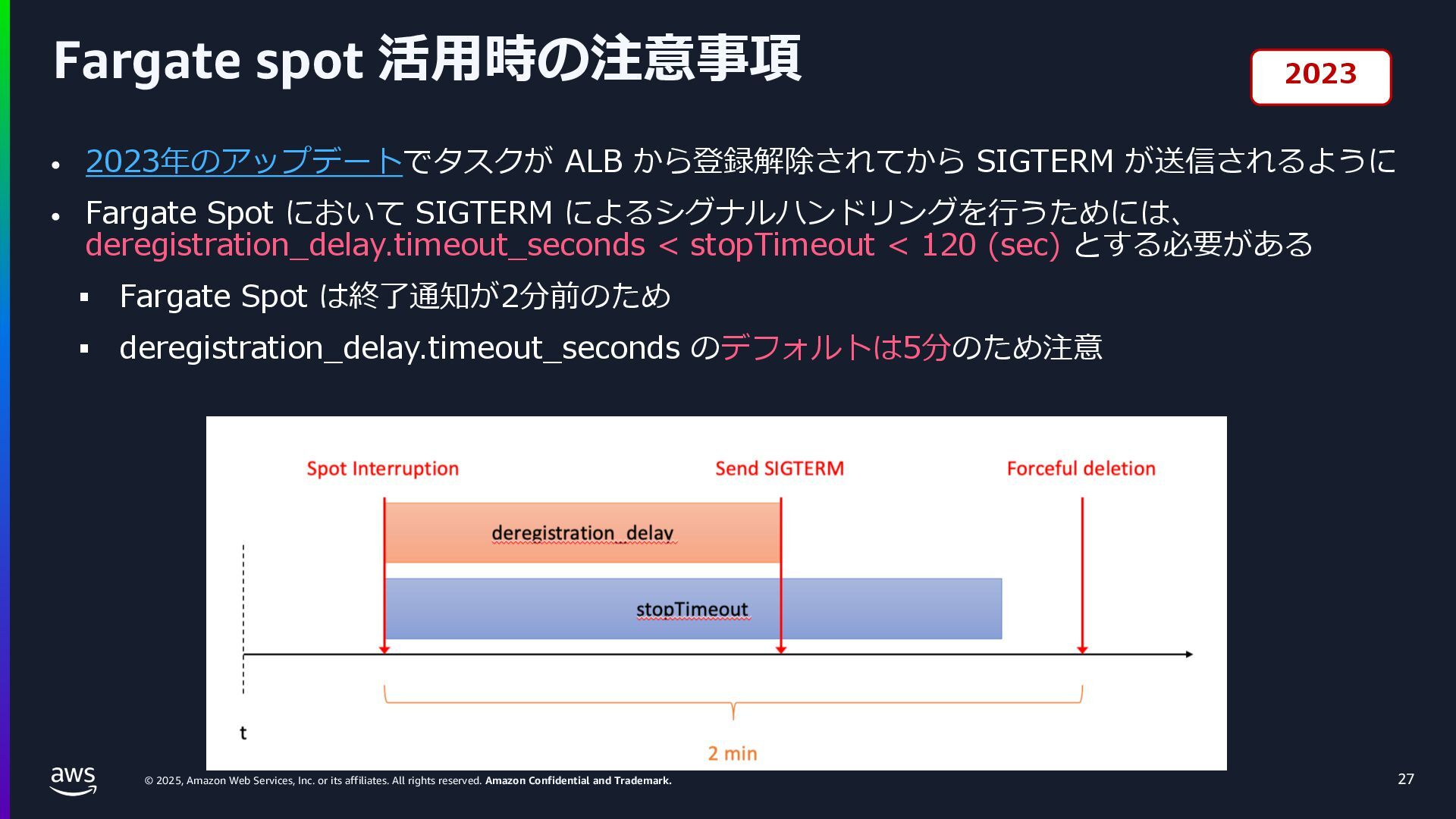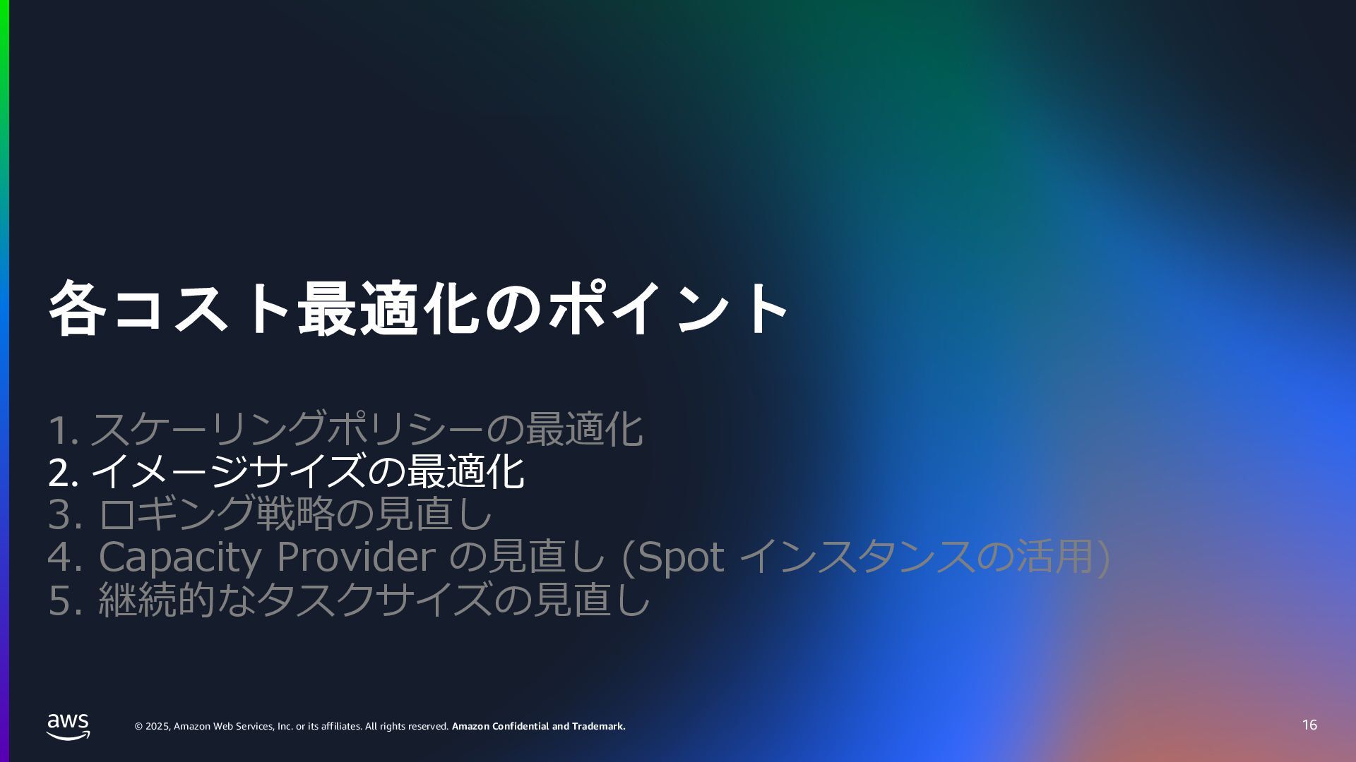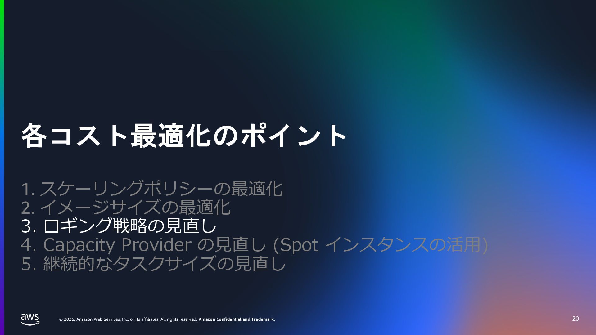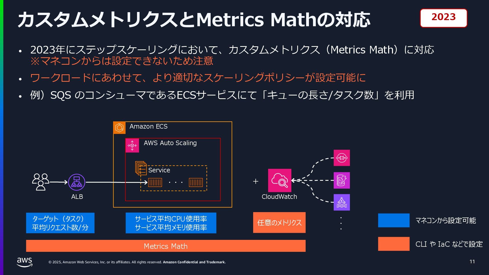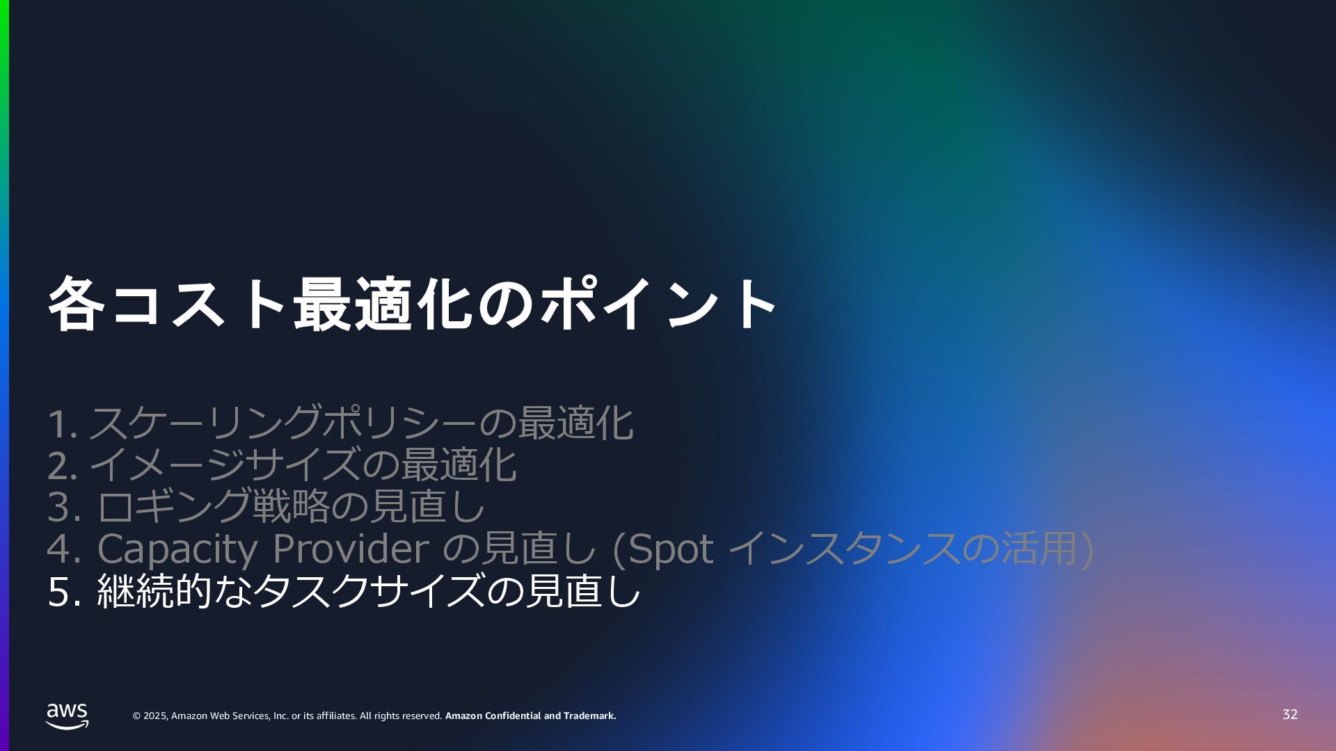 rights reserved. Amazon Confidential and Trademark. ECS Managed Instance の 起動 40 • インスタンスの起動には Auto Scaling Groupを 利⽤せずに EC2 CreateFleet API を利⽤ • タスクのサイズに応じて 適切なインスタンスタイプをECS側で選定 • インスタンスタイプに優先度をつけ、 Fleet API を⽤いて 優先度順に起動可能か確認し、インスタンスを起動 "CreateFleetRequest": { "LaunchTemplateConfigs": { "Overrides": [ { "Priority": "0.0", "InstanceType": "m6g.medium", "AvailabilityZone": ”ap-northeast-1a", // ... その他のフィールド }, { "Priority": "1.0", "InstanceType": "m7g.medium", "AvailabilityZone": "ap-northeast-1a", // ... }, { "Priority": "2.0", "InstanceType": "m6gd.medium", "AvailabilityZone": "ap-northeast-1a", // ... },