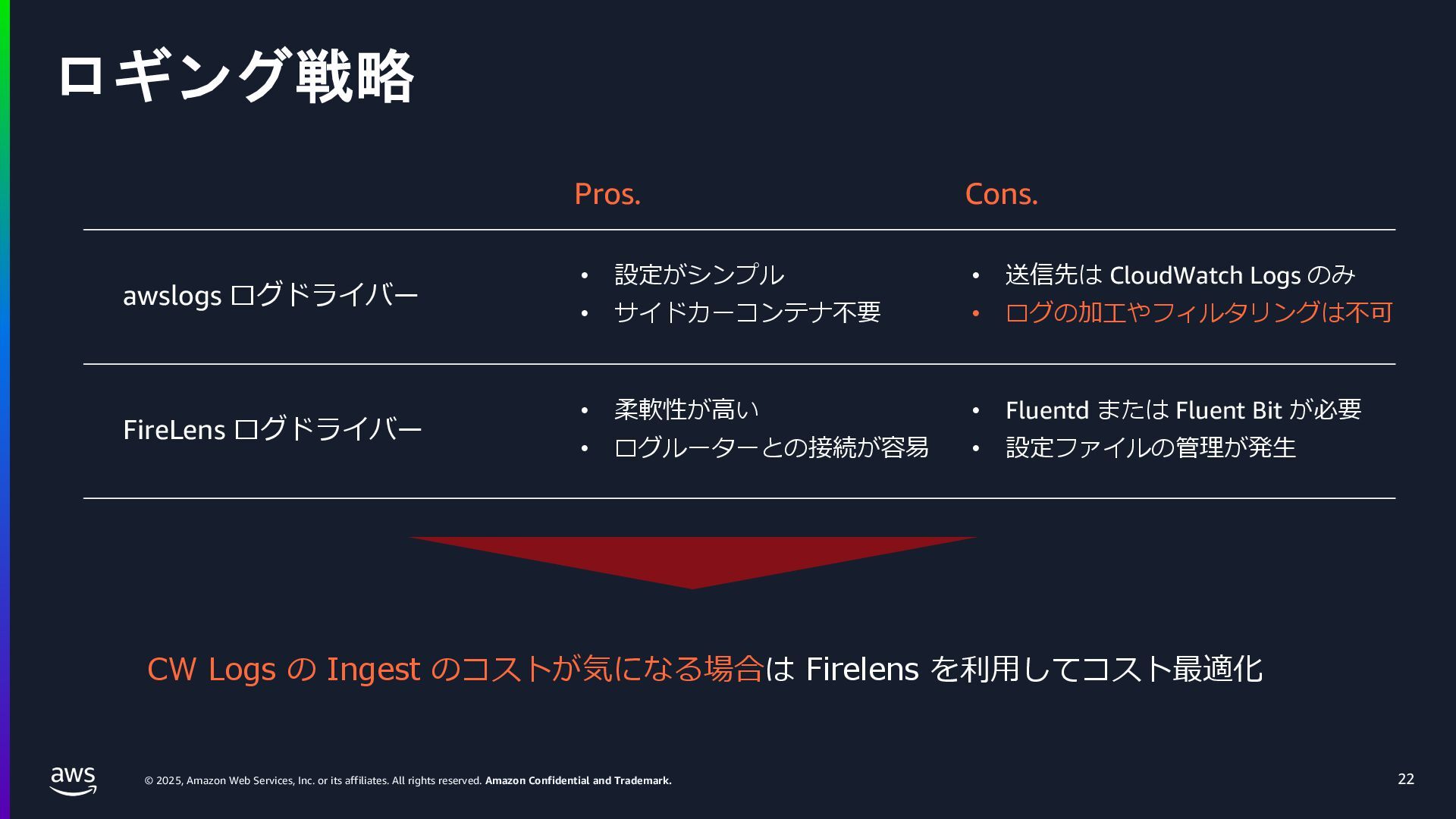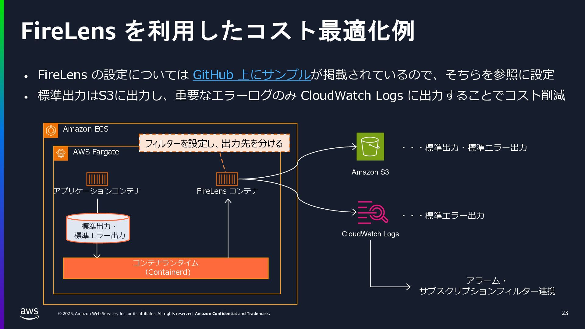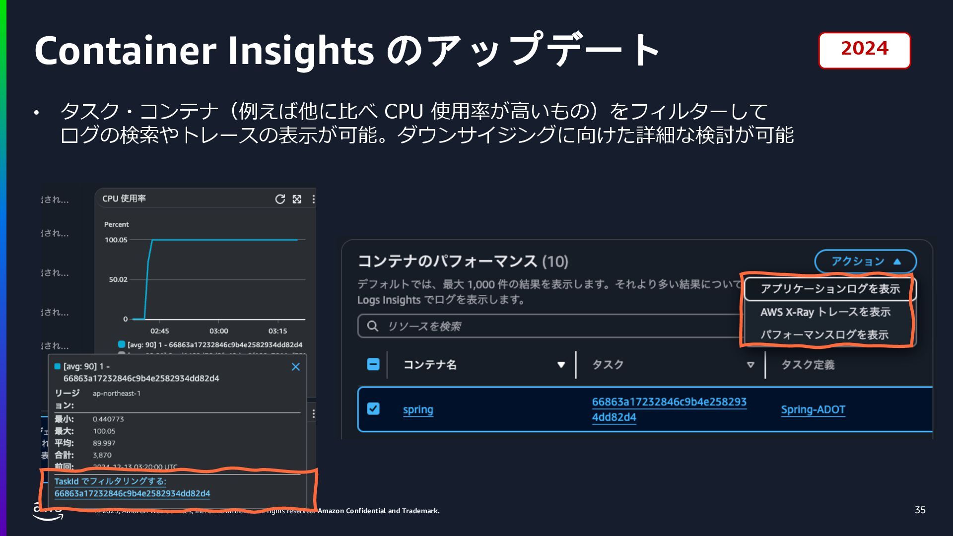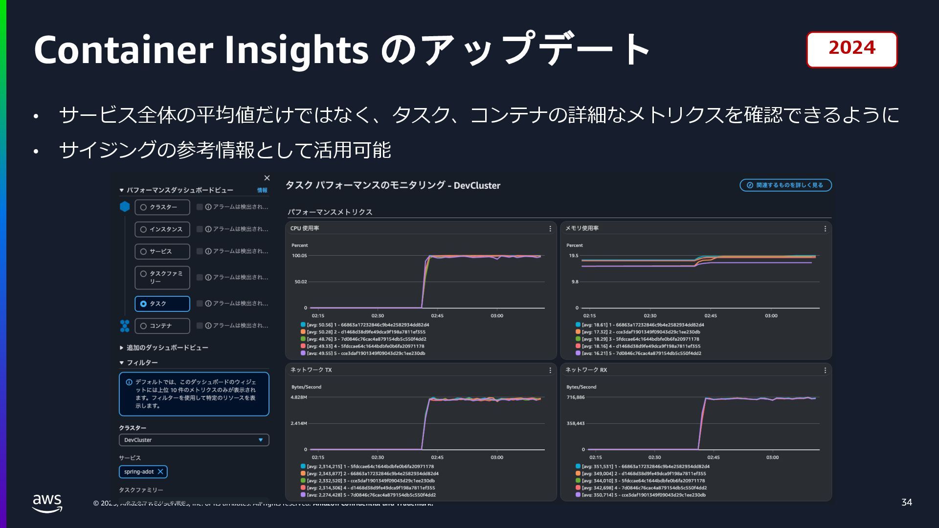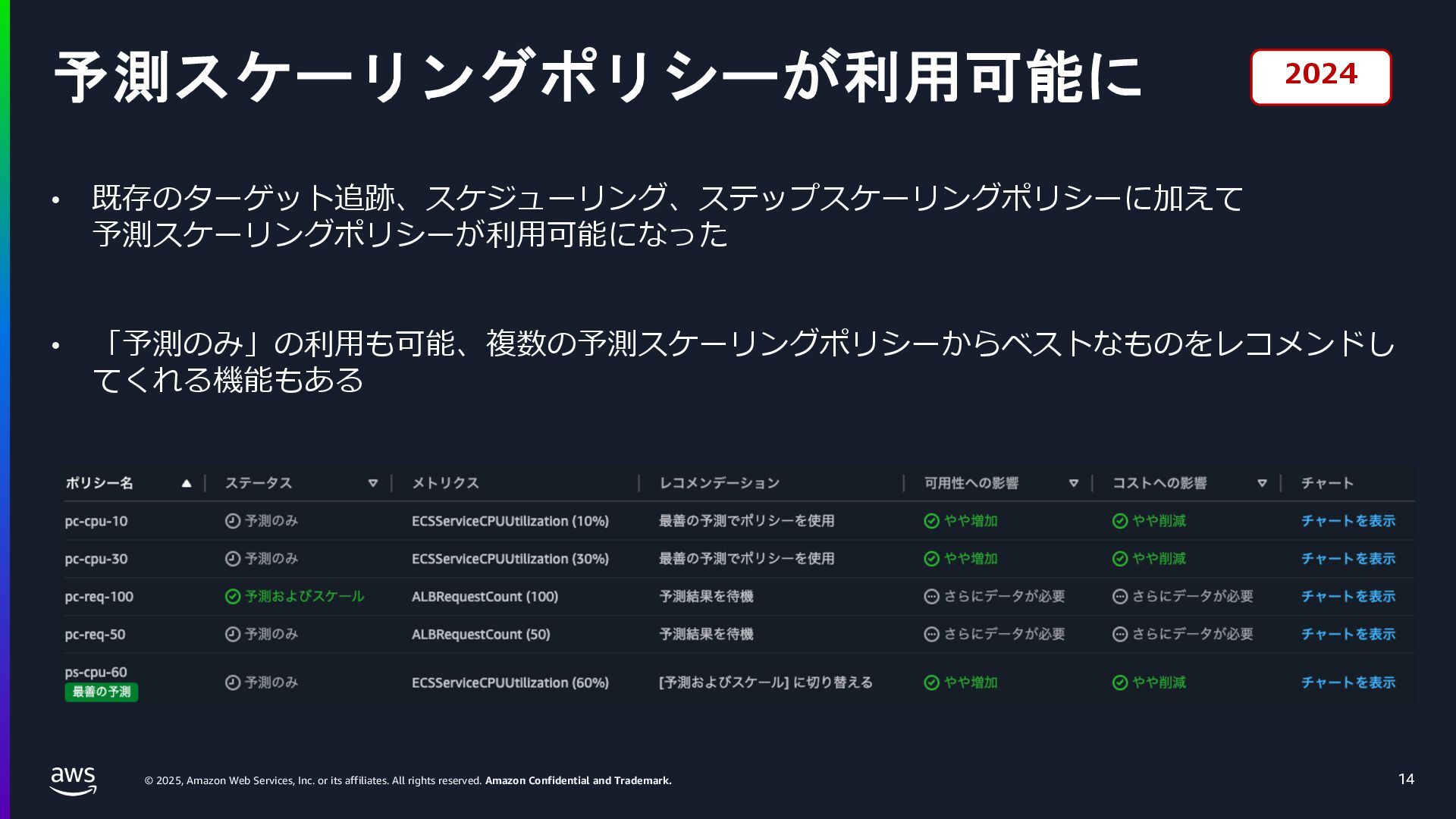 rights reserved. Amazon Confidential and Trademark. ECS Managed Instance の 起動 40 • インスタンスの起動には Auto Scaling Groupを 利⽤せずに EC2 CreateFleet API を利⽤ • タスクのサイズに応じて 適切なインスタンスタイプをECS側で選定 • インスタンスタイプに優先度をつけ、 Fleet API を⽤いて 優先度順に起動可能か確認し、インスタンスを起動 "CreateFleetRequest": { "LaunchTemplateConfigs": { "Overrides": [ { "Priority": "0.0", "InstanceType": "m6g.medium", "AvailabilityZone": ”ap-northeast-1a", // ... その他のフィールド }, { "Priority": "1.0", "InstanceType": "m7g.medium", "AvailabilityZone": "ap-northeast-1a", // ... }, { "Priority": "2.0", "InstanceType": "m6gd.medium", "AvailabilityZone": "ap-northeast-1a", // ... },