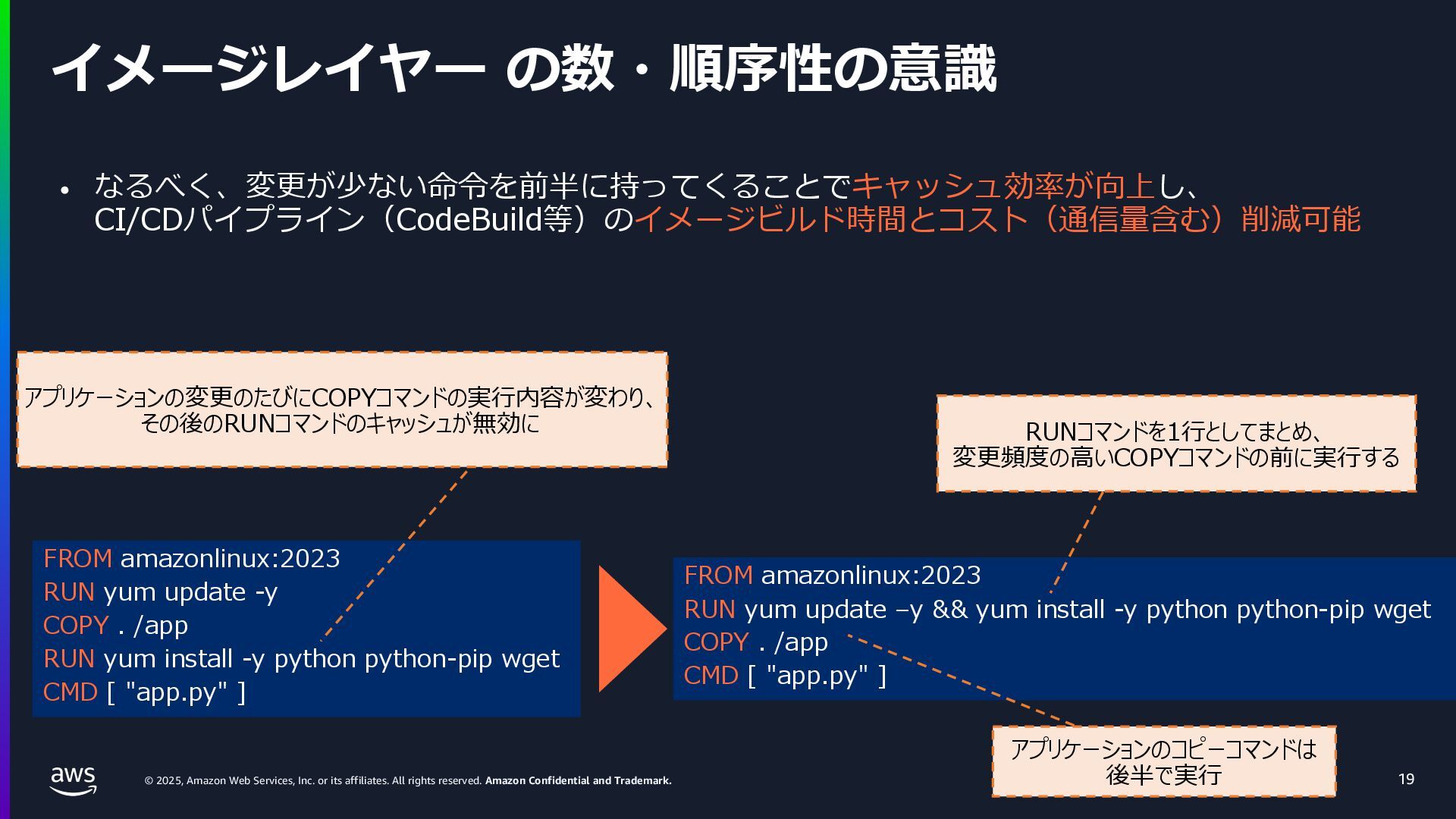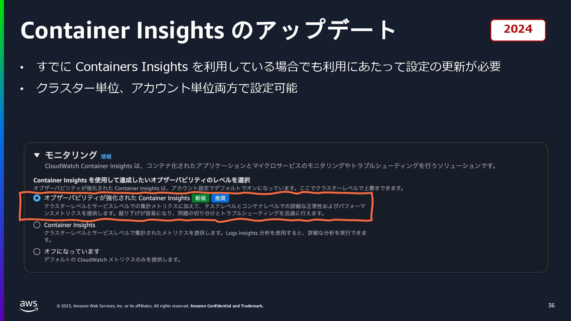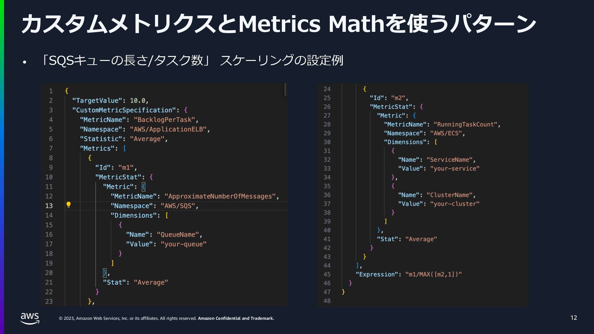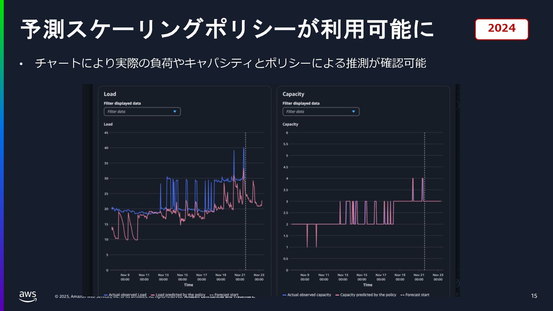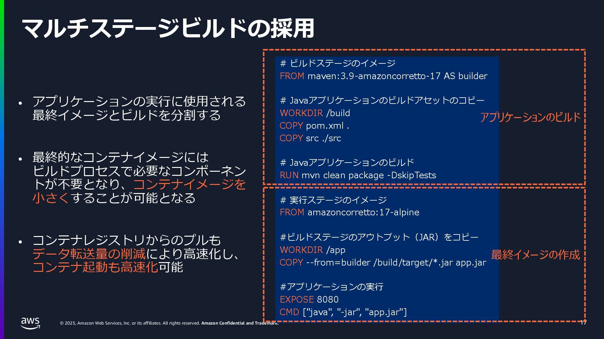 rights reserved. Amazon Confidential and Trademark. ECS Managed Instance の 起動 40 • インスタンスの起動には Auto Scaling Groupを 利⽤せずに EC2 CreateFleet API を利⽤ • タスクのサイズに応じて 適切なインスタンスタイプをECS側で選定 • インスタンスタイプに優先度をつけ、 Fleet API を⽤いて 優先度順に起動可能か確認し、インスタンスを起動 "CreateFleetRequest": { "LaunchTemplateConfigs": { "Overrides": [ { "Priority": "0.0", "InstanceType": "m6g.medium", "AvailabilityZone": ”ap-northeast-1a", // ... その他のフィールド }, { "Priority": "1.0", "InstanceType": "m7g.medium", "AvailabilityZone": "ap-northeast-1a", // ... }, { "Priority": "2.0", "InstanceType": "m6gd.medium", "AvailabilityZone": "ap-northeast-1a", // ... },