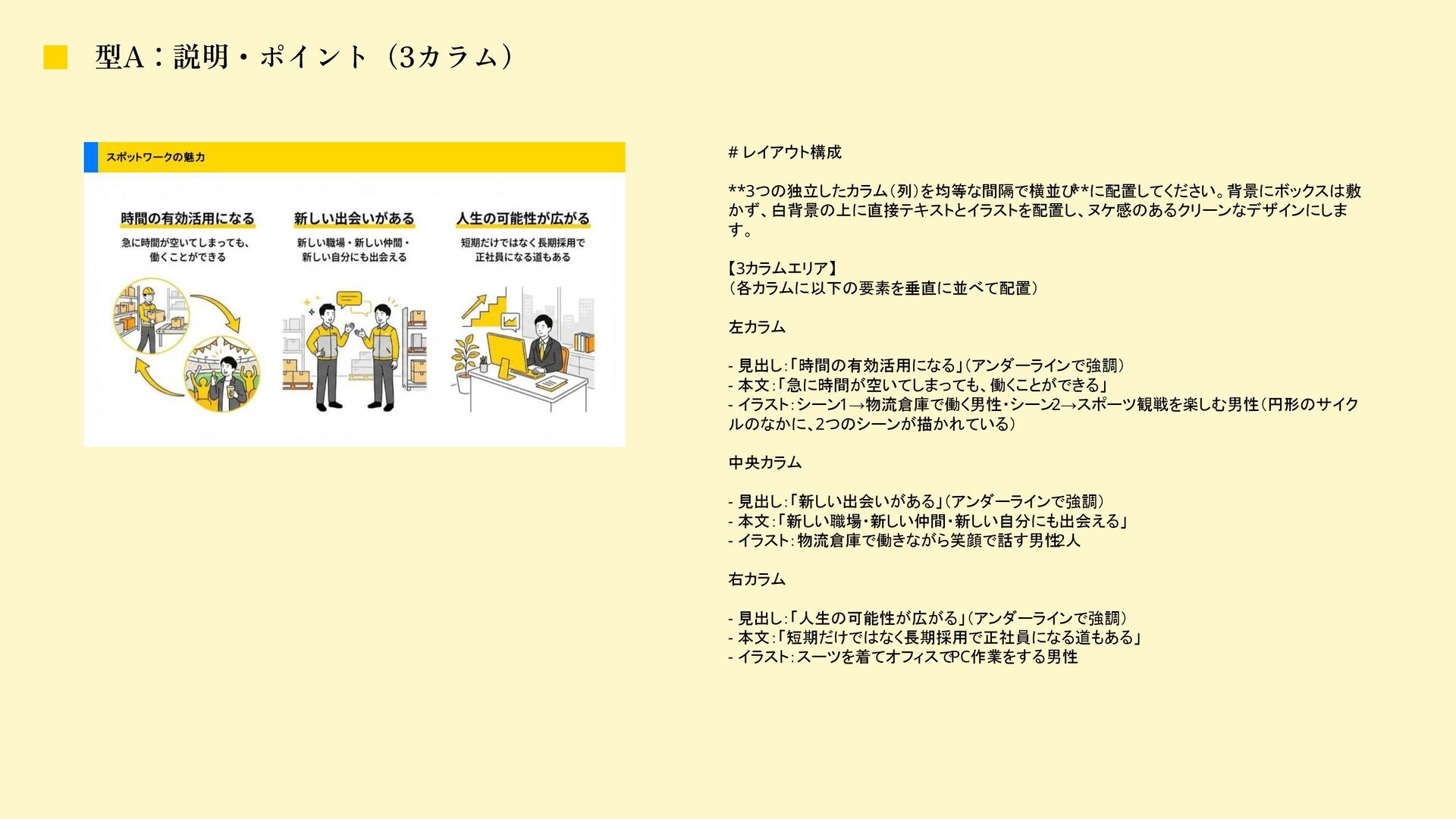 型A:説明・ポイント(3カラム) # レイアウト構成 **3つの独立したカラム(列)を均等な間隔で横並び **に配置してください。背景にボックスは敷 かず、白背景の上に直接テキストとイラストを配置し、ヌケ感のあるクリーンなデザインにしま す。 【3カラムエリア】