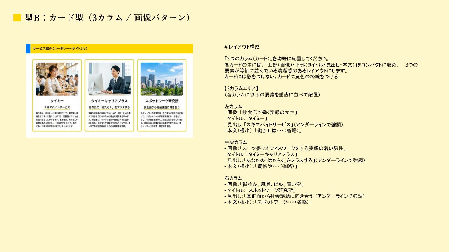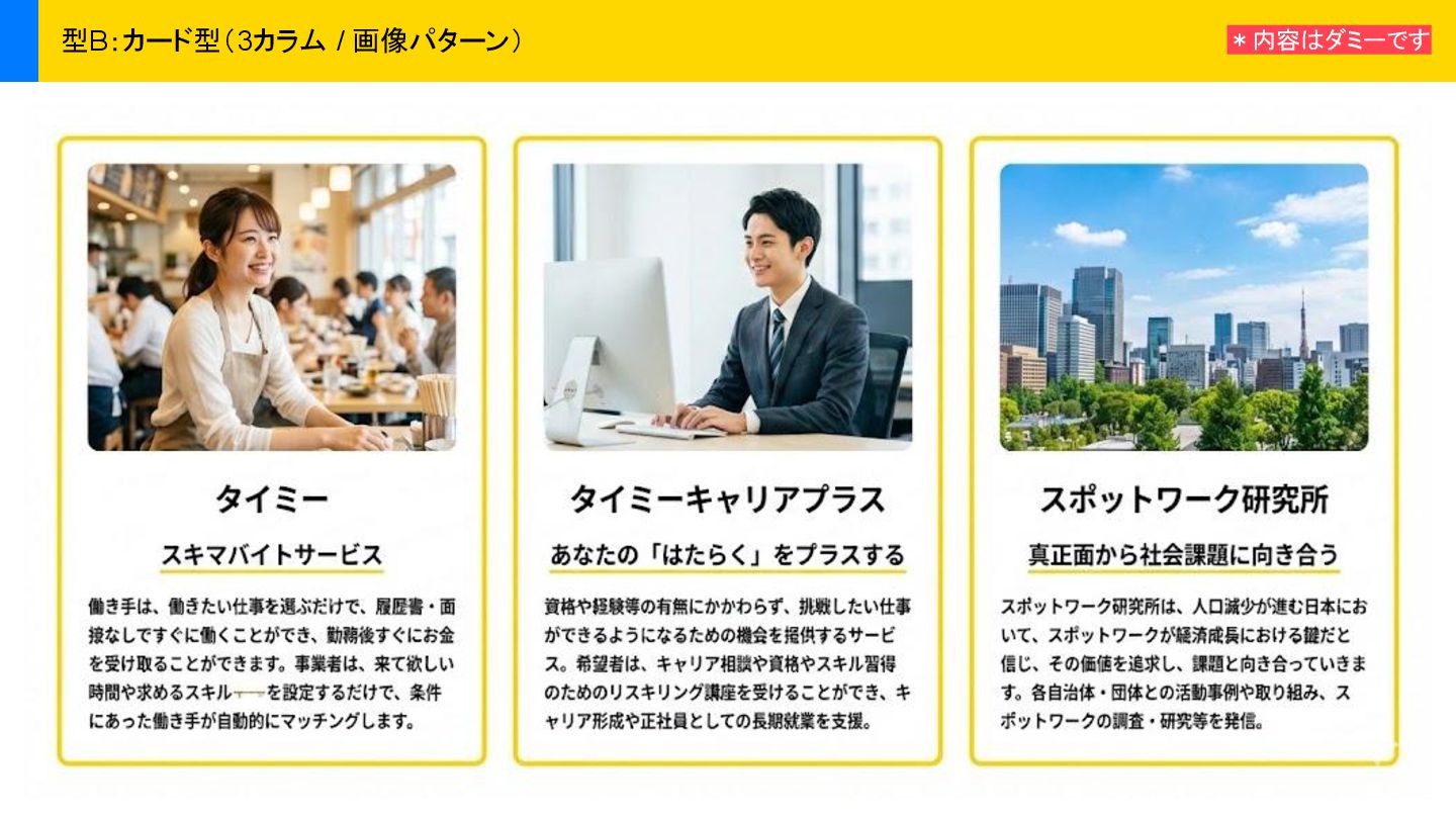 が等価に並んでいる清潔感のあるレイアウトにします。 カードには影をつけない。カードに黄色の枠線をつける 【3カラムエリア】 (各カラムに以下の要素を垂直に並べて配置) 左カラム - 画像:「飲食店で働く笑顔の女性」 - タイトル:「タイミー」 - 見出し:「スキマバイトサービス」(アンダーラインで強調) - 本文(極小):「働き⾃は・・・(省略)」 中央カラム - 画像:「スーツ姿でオフィスワークをする笑顔の若い男性」 - タイトル:「タイミーキャリアプラス」 - 見出し:「あなたの「はたらく」をプラスする」(アンダーラインで強調) - 本文(極小):「資格や・・・(省略)」 右カラム - 画像:「街並み、風景、ビル、青い空」 - タイトル:「スポットワーク研究所」 - 見出し:「真正面から社会課題に向き合う」(アンダーラインで強調) - 本文(極小):「スポットワーク・・・(省略)」
