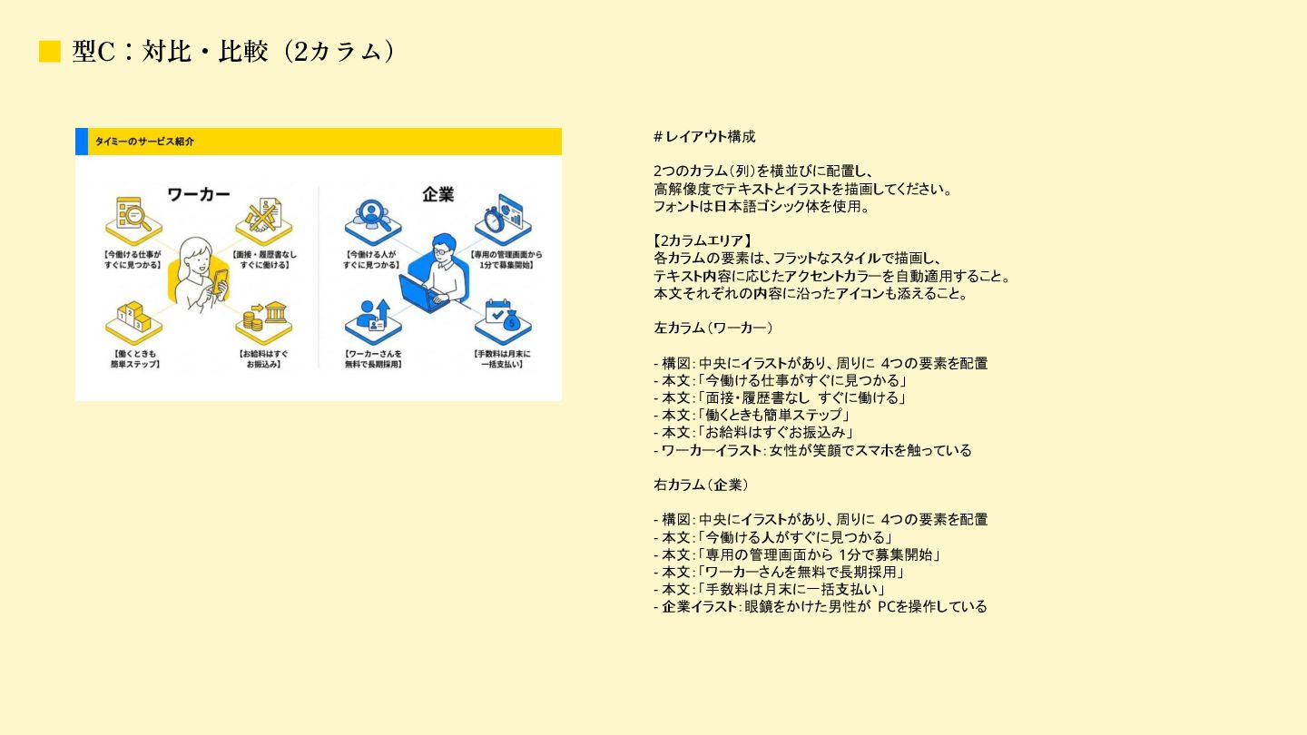 型C:対比・比較(2カラム) # レイアウト構成 2つのカラム(列)を横並びに配置し、 高解像度でテキストとイラストを描画してください。 フォントは日本語ゴシック体を使用。