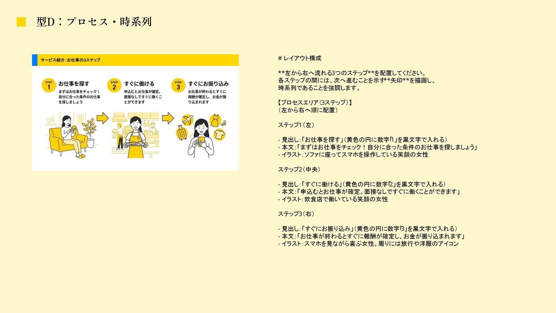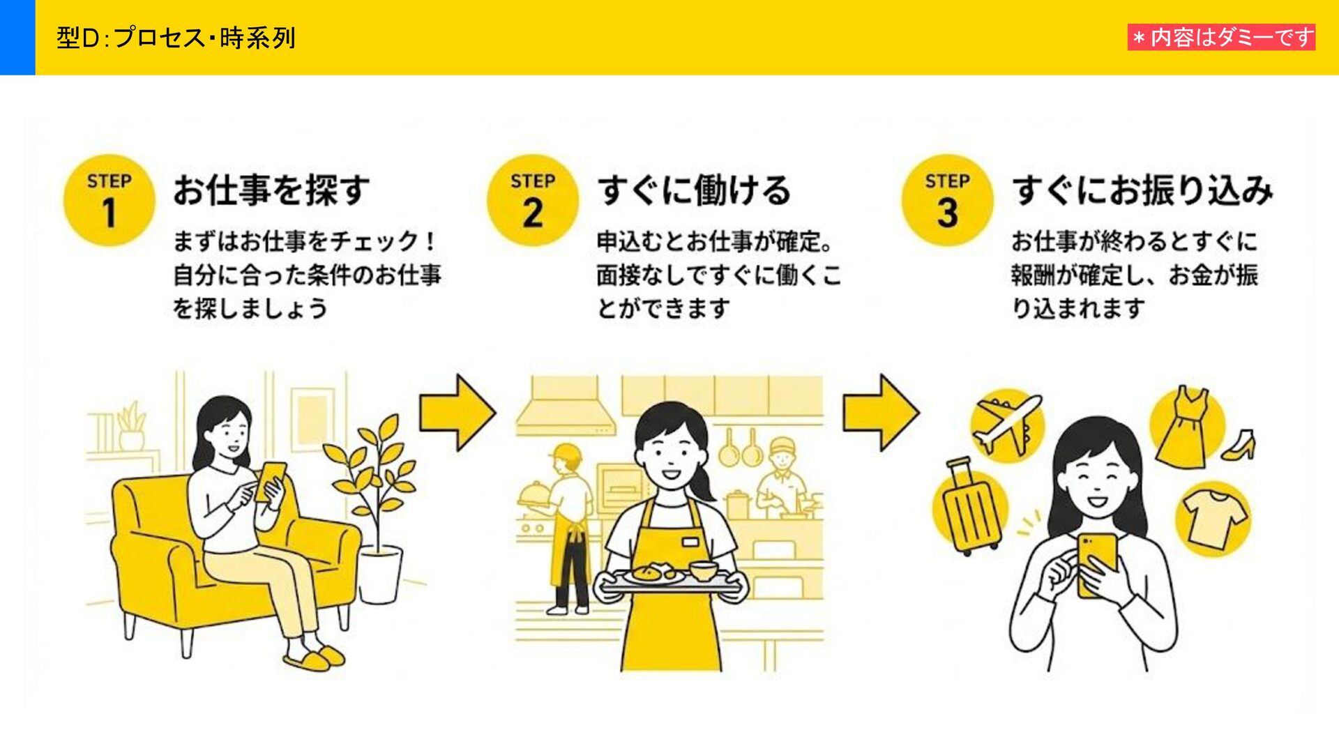 型D:プロセス・時系列 # レイアウト構成 **左から右へ流れる3つのステップ**を配置してください。 各ステップの間には、次へ進むことを示す **矢印**を描画し、 時系列であることを強調します。