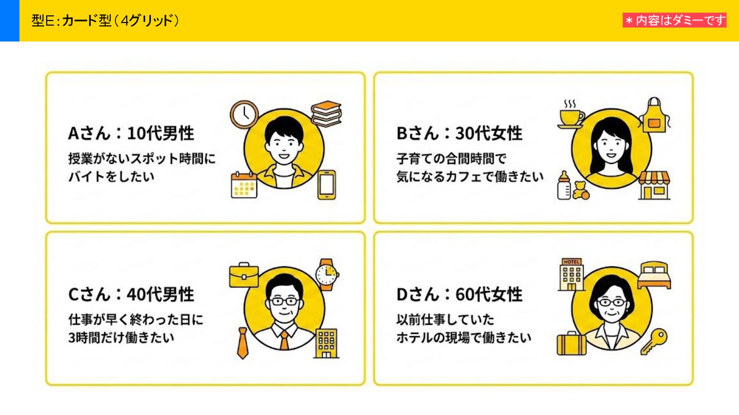 【4グリッドエリア】 左上・右上・左下・右下の順に配置 1. 左上グリッド - 見出し:「Aさん:10代男性」 - 本文:「授業がないスポット時間にバイトをしたい」 - イラスト:笑顔の若い男性。バストアップ 2. 右上グリッド - 見出し:「Bさん:30代女性」 - 本文:「子育ての合間時間で気になるカフェで働きたい」 - イラスト:笑顔の女性。バストアップ 3. 左下グリッド - 見出し:「Cさん:40代男性」 - 本文:「仕事が早く終わった日に 3時間だけ働きたい」 - イラスト:笑顔の眼鏡をかけた中年男性。バストアップ 4. 右下グリッド - 見出し:「Dさん:60代女性」 - 本文:「以前仕事していたホテルの現場で働きたい」 - イラスト:笑顔の眼鏡をかけた女性。バストアップ