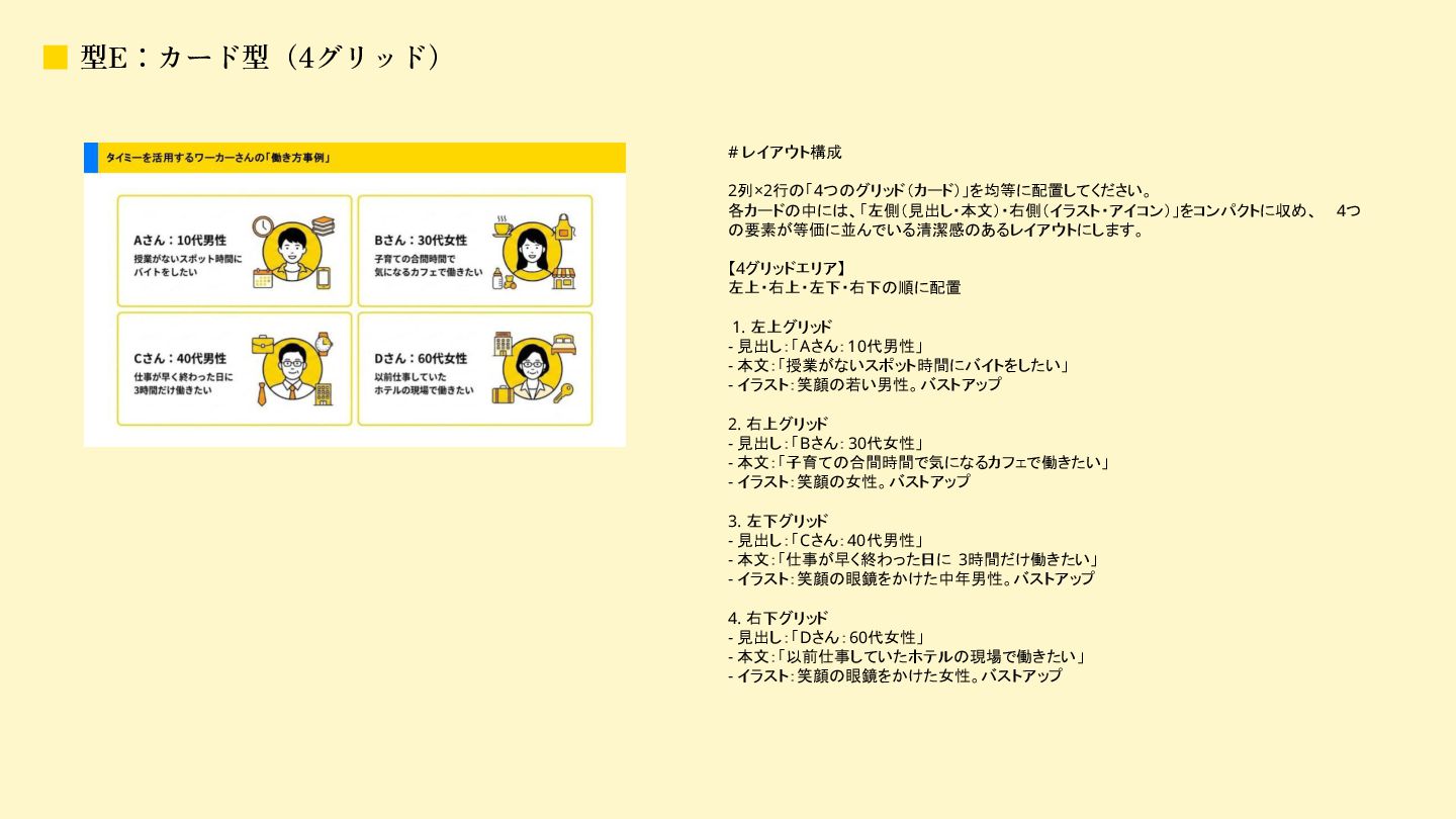 型E:カード型(4グリッド) # レイアウト構成 2列×2行の「4つのグリッド(カード)」を均等に配置してください。 各カードの中には、「左側(見出し・本文)・右側(イラスト・アイコン)」をコンパクトに収め、 4つの 要素が等価に並んでいる清潔感のあるレイアウトにします。