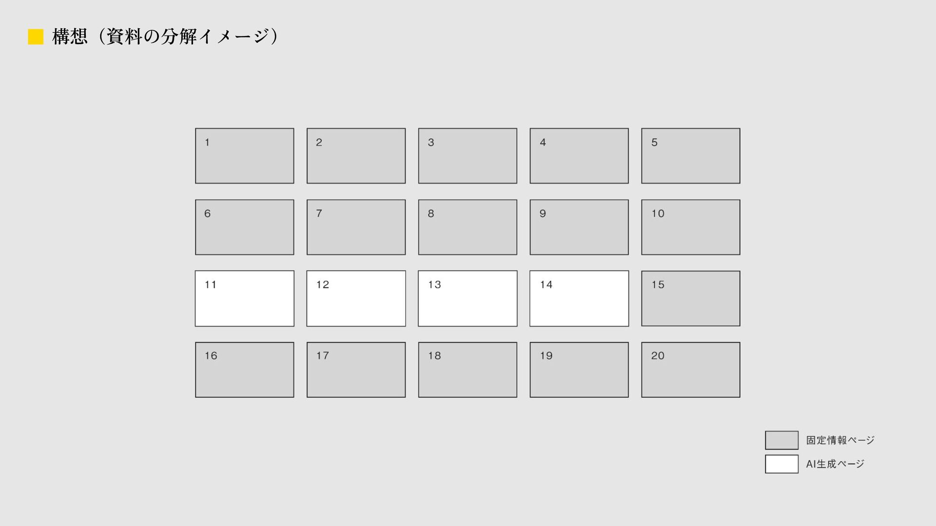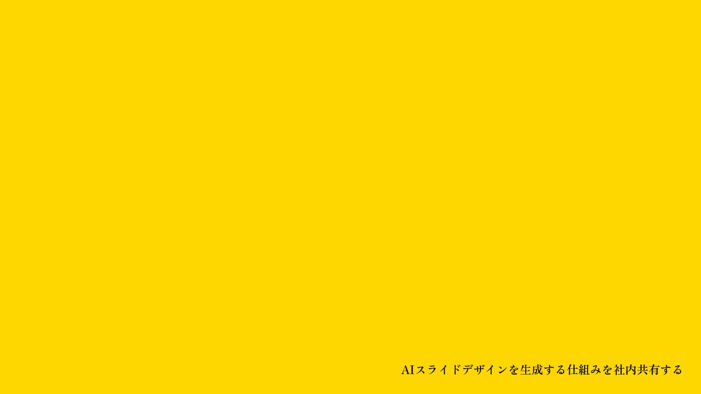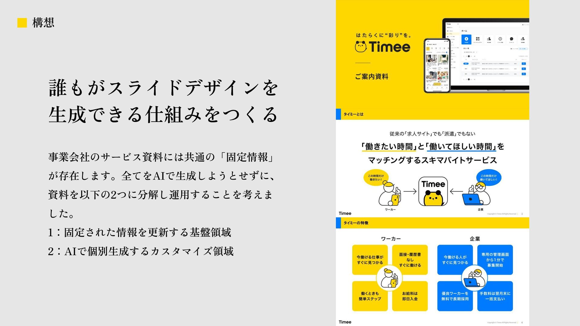 構想 誰もがスライドデザインを 生成できる仕組みをつくる 事業会社のサービス資料には共通の「固定情報」 が存在します。全てをAIで生成しようとせずに、 資料を以下の2つに分解し運用することを考えま した。 1:固定された情報を更新する基盤領域 2:AIで個別生成するカスタマイズ領域