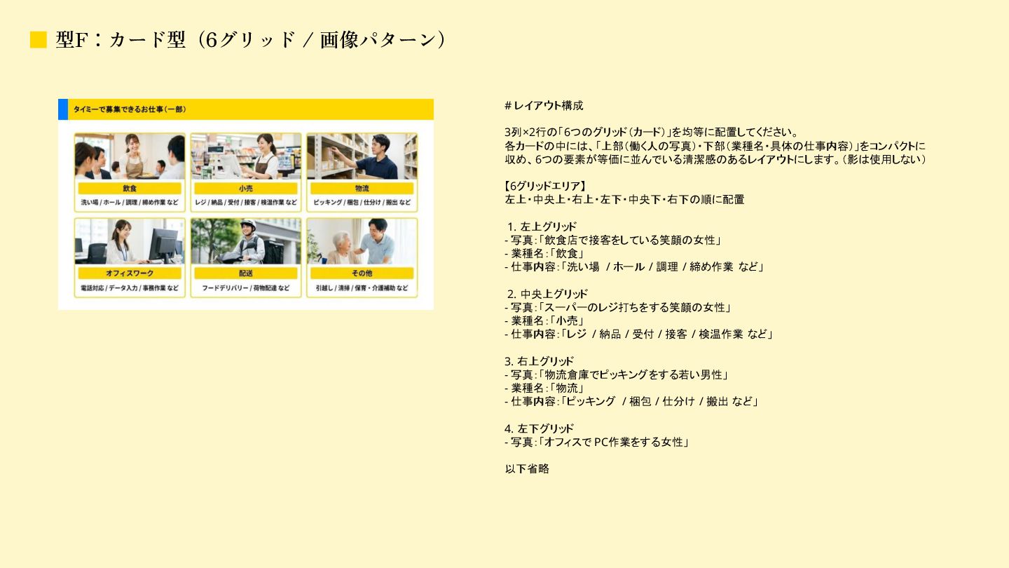 型F:カード型(6グリッド / 画像パターン) # レイアウト構成 3列×2行の「6つのグリッド(カード)」を均等に配置してください。 各カードの中には、「上部(働く人の写真)・下部(業種名・具体の仕事内容)」をコンパクトに収 め、6つの要素が等価に並んでいる清潔感のあるレイアウトにします。(影は使用しない)