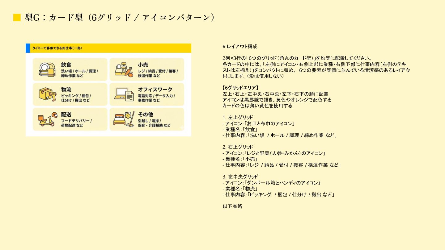(影は使用しない) 【6グリッドエリア】 左上・右上・左中央・右中央・左下・右下の順に配置 アイコンは黒罫線で描き、黄色やオレンジで配色する カードの色は薄い黄色を使用する 1. 左上グリッド - アイコン:「お皿と布巾のアイコン」 - 業種名:「飲食」 - 仕事内容:「洗い場 / ホール / 調理 / 締め作業 など」 2. 右上グリッド - アイコン:「レジと野菜(人参・みかん)のアイコン」 - 業種名:「小売」 - 仕事内容:「レジ / 納品 / 受付 / 接客 / 検温作業 など」 3. 左中央グリッド - アイコン:「ダンボール箱とハンディのアイコン」 - 業種名:「物流」 - 仕事内容:「ピッキング / 梱包 / 仕分け / 搬出 など」 以下省略