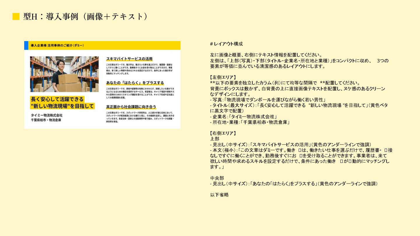 【左側エリア】 **以下の要素を独立したカラム(列)にて均等な間隔で **配置してください。 背景にボックスは敷かず、白背景の上に直接画像テキストを配置し、ヌケ感のあるクリーンなデ ザインにします。 - 写真:「物流現場でダンボールを運びながら働く若い男性」 - タイトル(最大サイズ):「長く安心して活躍できる "新しい物流現場"を目指して」(黄色ベタに黒 文字で配置) - 企業名:「タイミー物流株式会社」 - 所在地・業種:「千葉県柏市・物流倉庫」 【右側エリア】 上部 - 見出し(中サイズ):「スキマバイトサービスの活用」(黄色のアンダーラインで強調) - 本文(極小):「この文章はダミーです。働き ⾃は、働きたい仕事を選ぶだけで、履歴書・ ⾃接なし ですぐに働くことができ、勤務後すぐにお ⾃を受け取ることができます。事業者は、来て欲しい時 間や求めるスキルを設定するだけで、条件にあった働き ⾃が⾃動的にマッチングします。」 中央部 - 見出し(中サイズ):「あなたの「はたらく」をプラスする」(黄色のアンダーラインで強調) 以下省略