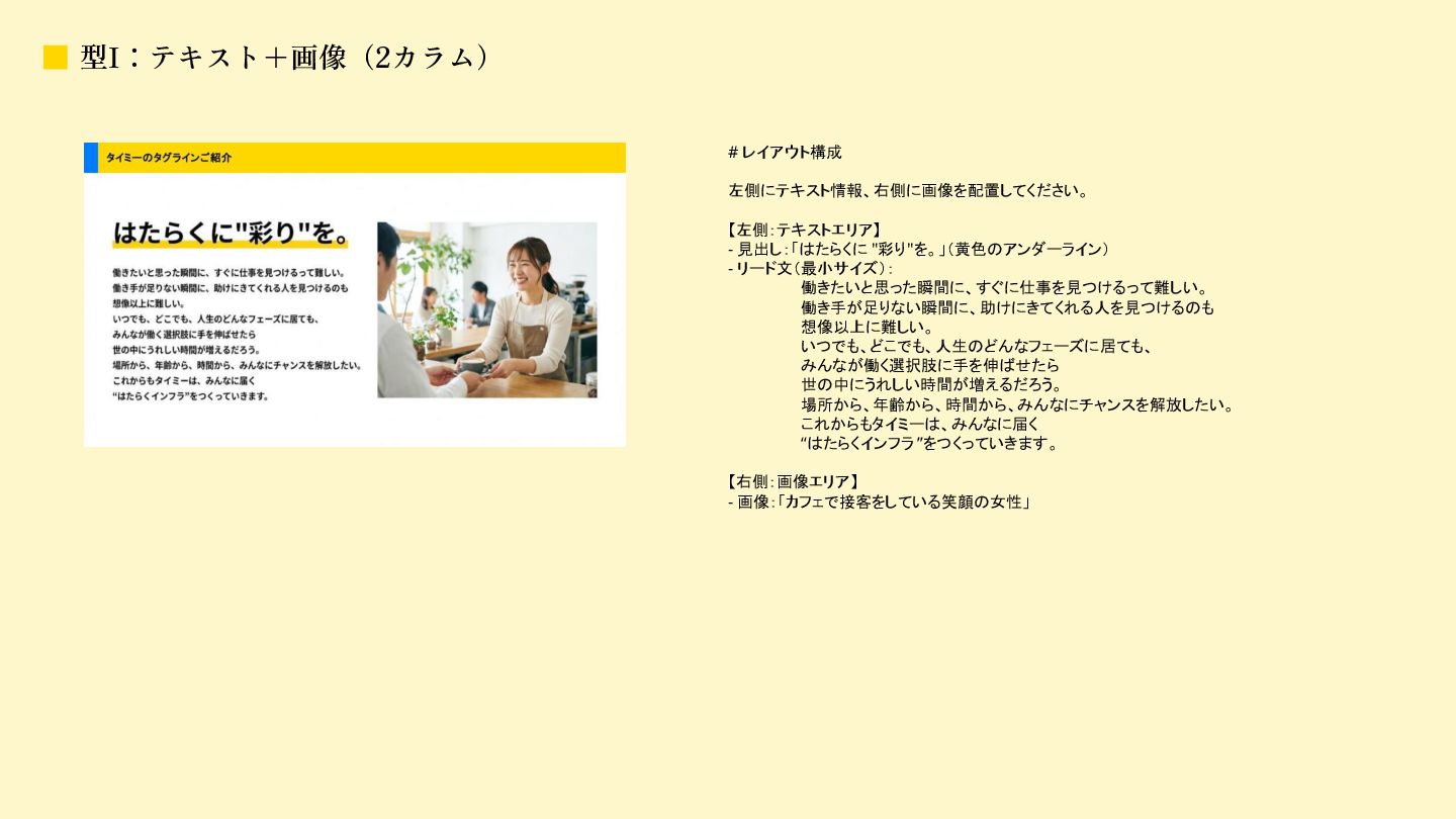 型I:テキスト+画像(2カラム) # レイアウト構成 左側にテキスト情報、右側に画像を配置してください。 【左側:テキストエリア】 -