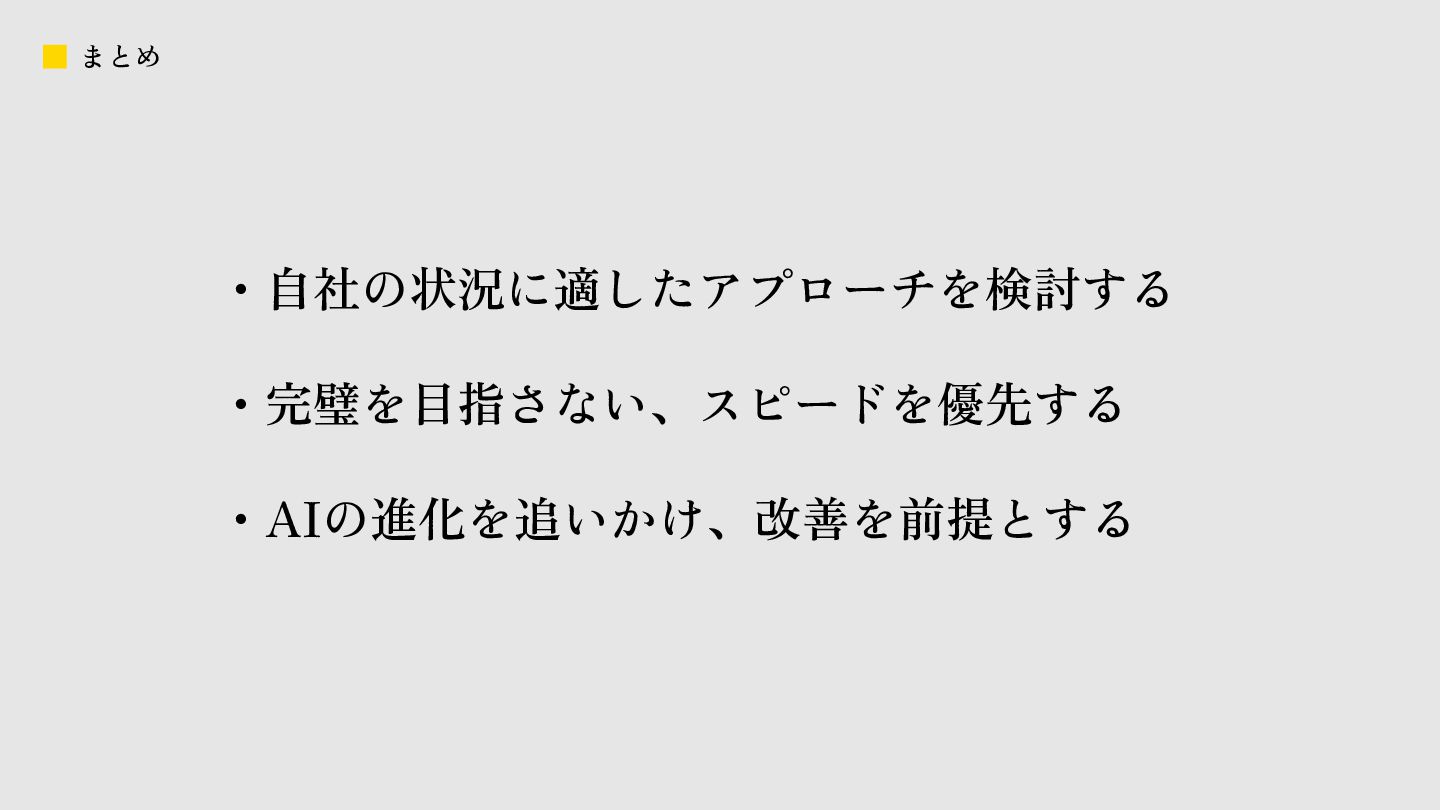 まとめ ・自社の状況に適したアプローチを検討する ・完璧を目指さない、スピードを優先する ・AIの進化を追いかけ、改善を前提とする