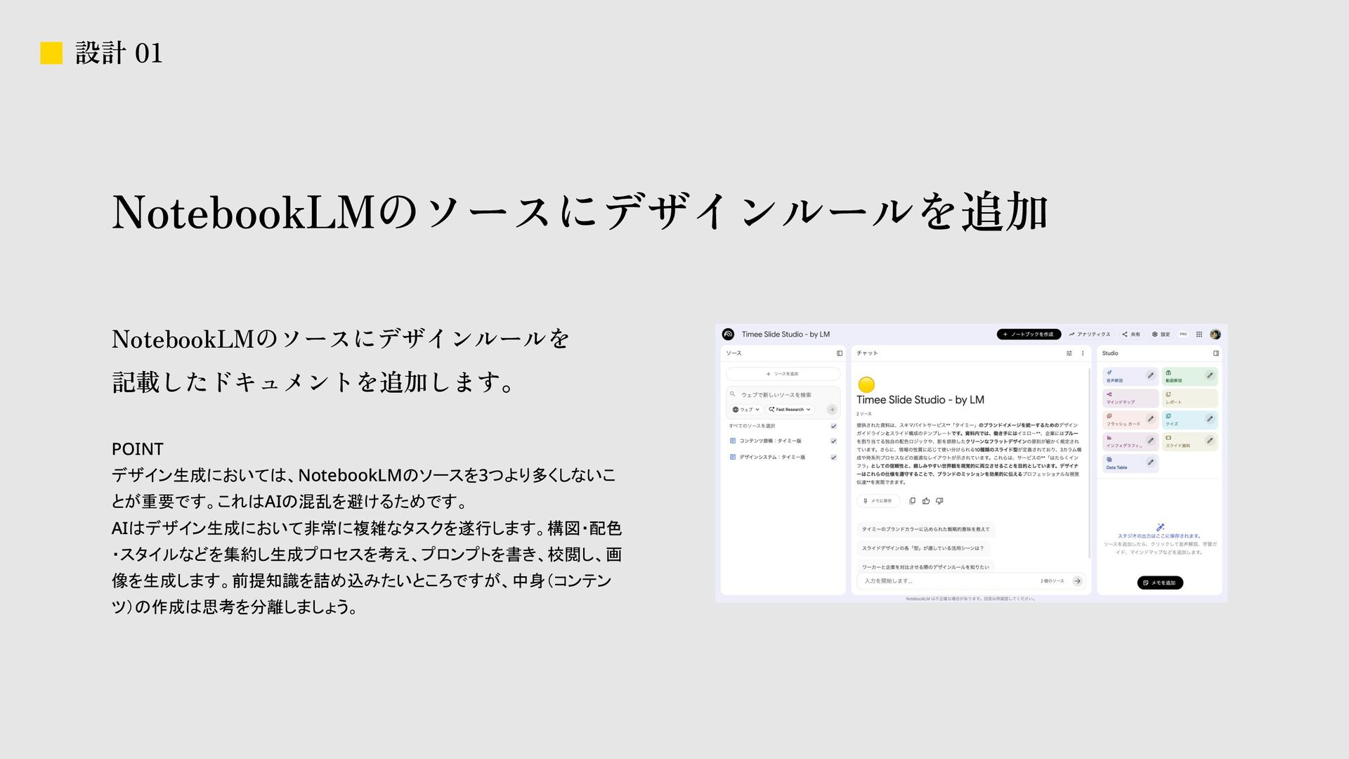 設計 01 NotebookLMのソースにデザインルールを追加 NotebookLMのソースにデザインルールを 記載したドキュメントを追加します。 POINT デザイン生成においては、NotebookLMのソースを3つより多くしないこ とが重要です。これはAIの混乱を避けるためです。 AIはデザイン生成において非常に複雑なタスクを遂行します。構図・配色 ・スタイルなどを集約し生成プロセスを考え、プロンプトを書き、校閲し、画