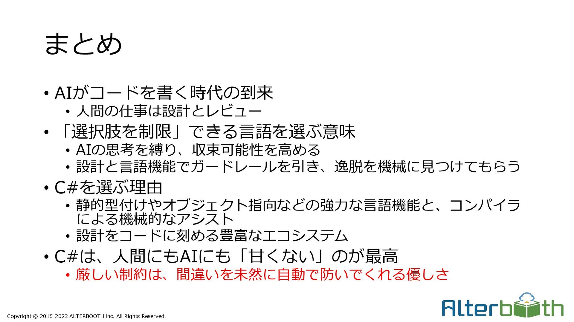 AIエージェントがコードを各時代に、我々は何故C#を選ぶのか?という内容です。