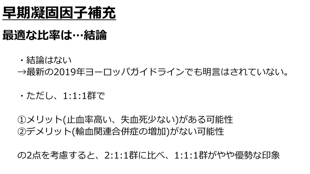 早期凝固因子補充 最適な比率は…結論 ・結論はない →最新の2019年ヨーロッパガイドラインでも明言はされていない。 ・ただし、1:1:1群で ①メリット(止血率高い、失血死少ない)がある可能性 ②デメリット(輸血関連合併症の増加)がない可能性 の2点を考慮すると、2:1:1群に比べ、1:1:1群がやや優勢な印象