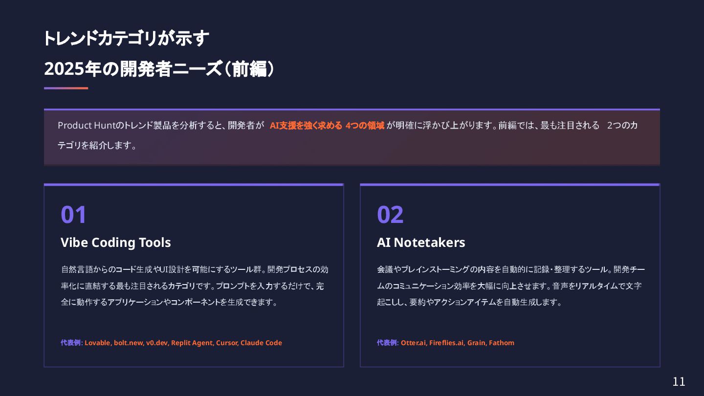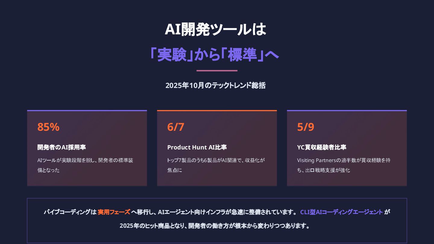 「バイブコーディング」と「AI駆動開発」及びスタートアップ界隈の最新動向を集めたレポートを「テックトレンド速報10月16日号」として作成しました。