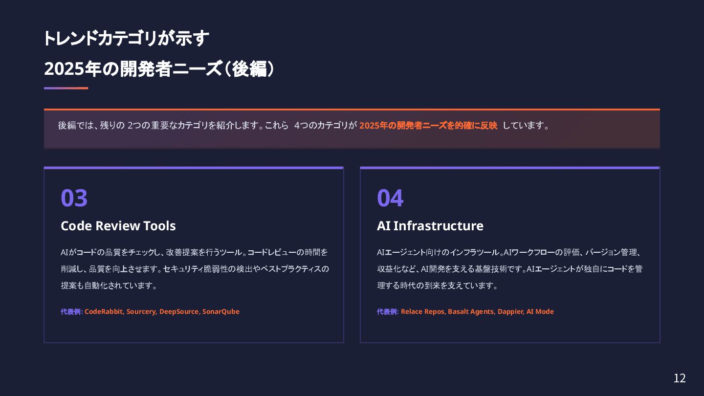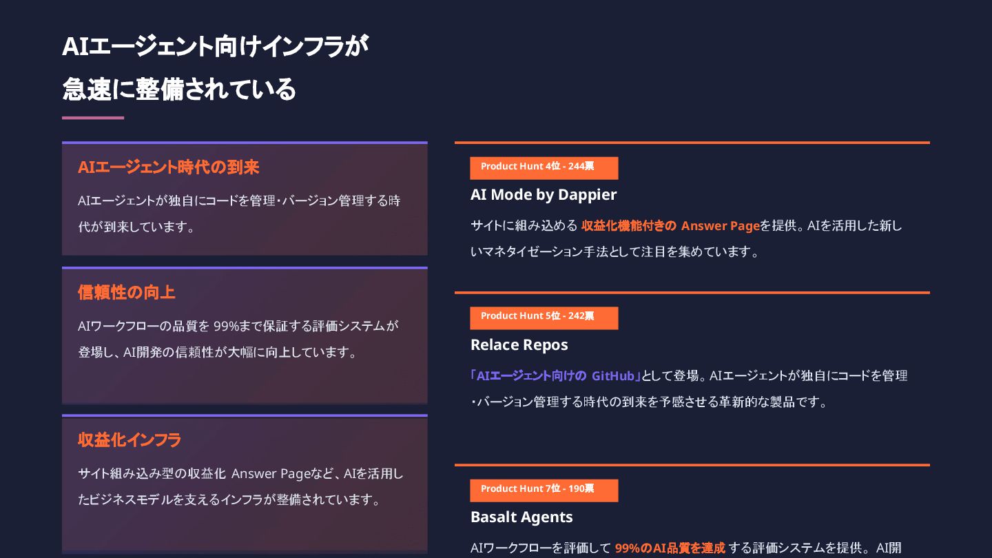 興味深いことは、米国ではバイブコーディングは実用フェーズへ移行し、AIエージェント向けインフラが急速に整備されていることです。CLI型AIコーディングエージェントが2025年のヒット商品となり、開発者の働き方が根本から変わりつつあるようです。