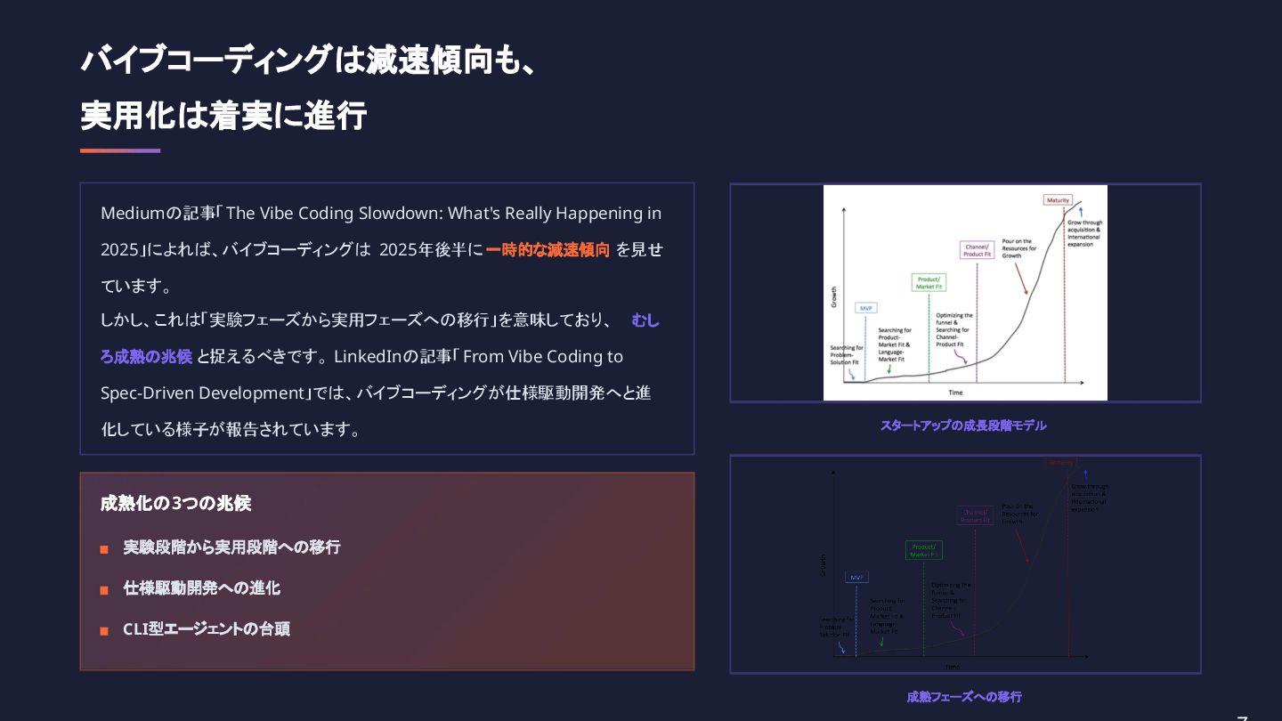 ・バイブコーディングは減速傾向も、実用化は着実に進行
