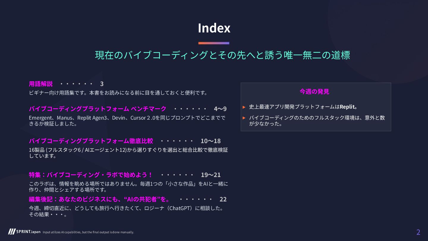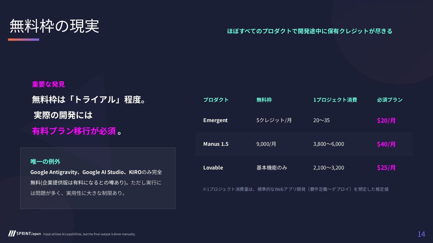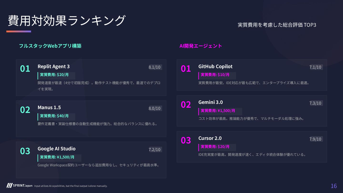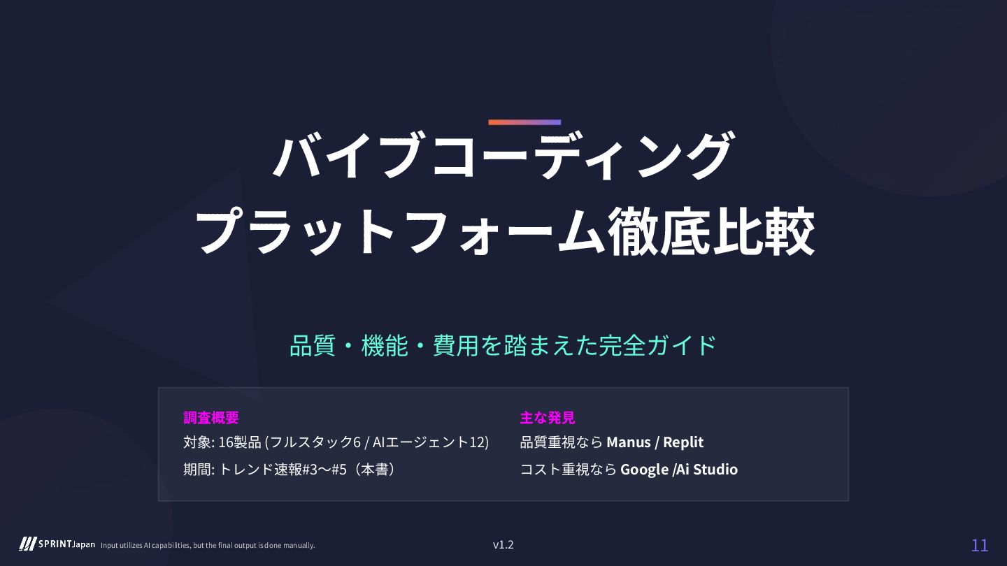 done manually. バイブコーディングプラットフォーム全プロダクト⼀覧 調査対象全18製品の分類‧実質費⽤‧特徴まとめ フルスタックWebアプリ構築 (6製品) プロダクト 実質費⽤ 主な特徴 Replit Agent 3 $20/⽉ 開発速度最速(4分)、動作テスト優秀 Manus 1.5 $40/⽉ 要件定義書‧仕様書⾃動⽣成、Notion連携 Lovable $25/⽉ LP⽣成品質最⾼、セキュリティ機能充実 Bolt.new ¥3,000/⽉ CRUD機能に強み、⾼速開発 v0 (Vercel) ¥3,000/⽉ UIコンポーネント⽣成特化、プレビュー最速 Emergent $20/⽉ ⾮技術者向け、会話でアプリ変換 Google AI Studio ¥1,500/⽉ 無料枠を超えてリクエストを送信すると課⾦ が発⽣ Google Antigravity 無料 完全無料だが開発サーバー不安定 Figma Make ¥3,300/⽉ UI/UX実装‧CRUD機能も実装可能 AI開発エージェント (12製品) プロダクト 実質費⽤ 主な特徴 Cursor 2.0 $20/⽉ Composer1が⾼速‧コード⽣成全体のバランス GitHub Copilot $10/⽉ IDE対応最広範、エンタープライズ向け Gemini 3.0 ¥1,500/⽉ 推論能⼒優秀、マルチモーダル処理 ChatGPT 5.1 ¥3,000/⽉ 仕様書作成に特化、実装機能なし Claude Code ¥3,000/⽉ ー未実施(次号予定)ー Claude Sonnet 4.5 ¥3,000/⽉ 実装ファイル⽣成に強み Codex ¥3,000/⽉ ー未実施(次号予定)ー ParaFlow ¥4,000/⽉ UI/UX設計特化、プロダクトデザインAI KIRO 無料 要件定義‧仕様書作成‧タスク管理が最も詳 細‧丁寧 Devin $20/⽉ 技術者向け、アプリ開発だけでは⼒を発揮し きれてない模様