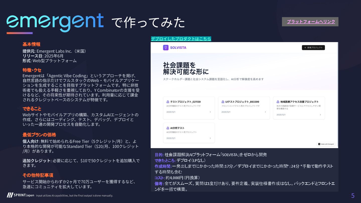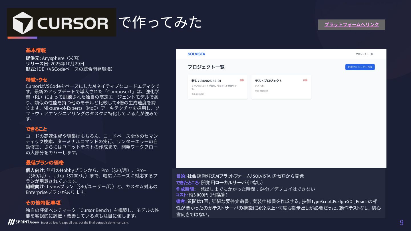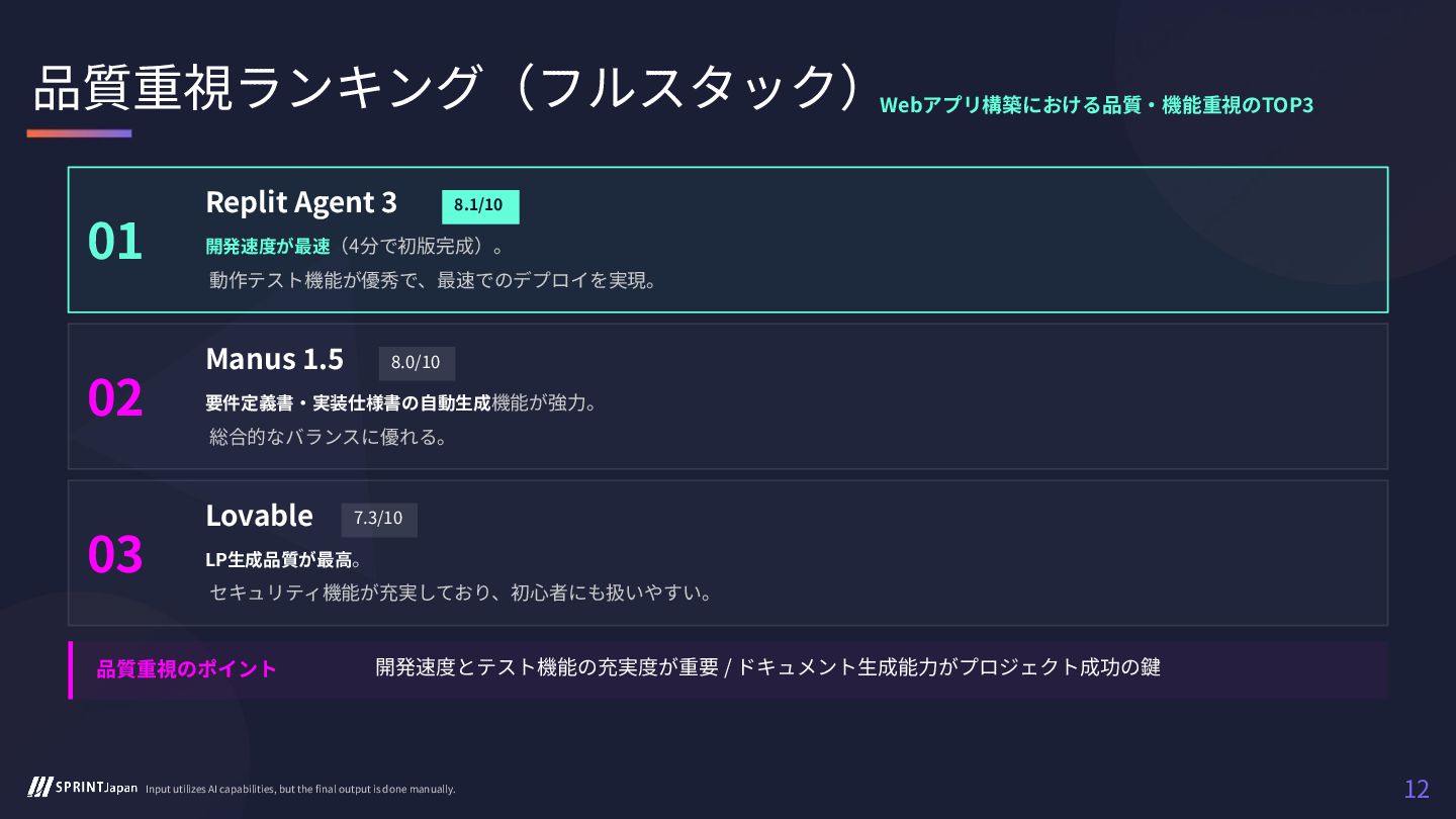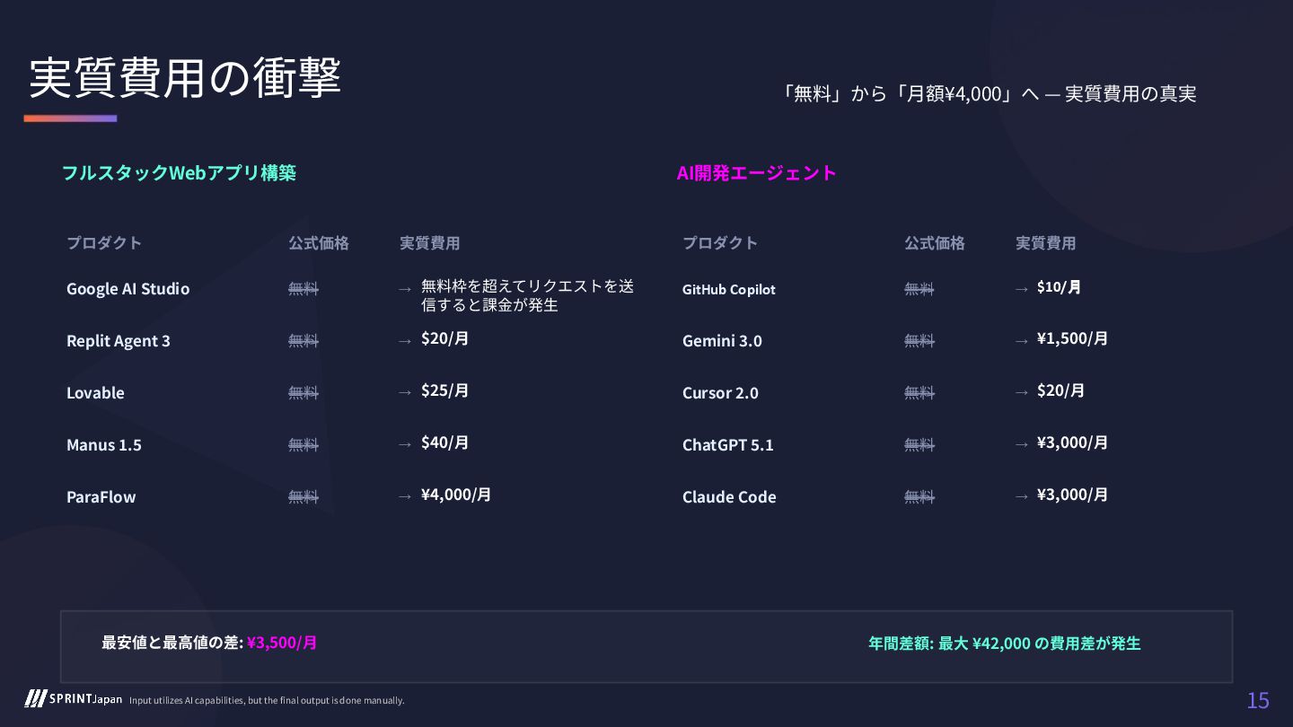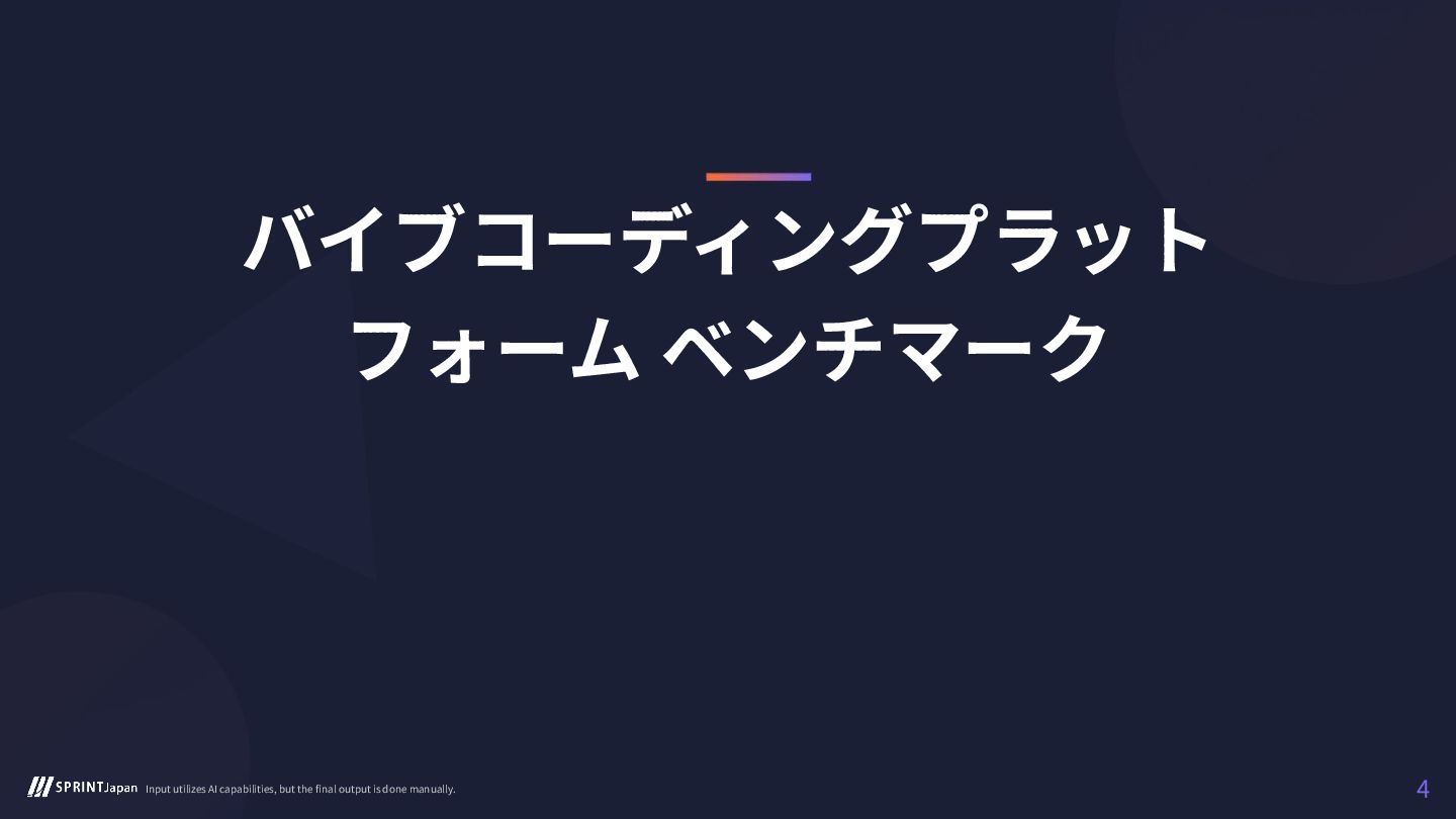 done manually. バイブコーディングプラットフォーム全プロダクト⼀覧 調査対象全18製品の分類‧実質費⽤‧特徴まとめ フルスタックWebアプリ構築 (6製品) プロダクト 実質費⽤ 主な特徴 Replit Agent 3 $20/⽉ 開発速度最速(4分)、動作テスト優秀 Manus 1.5 $40/⽉ 要件定義書‧仕様書⾃動⽣成、Notion連携 Lovable $25/⽉ LP⽣成品質最⾼、セキュリティ機能充実 Bolt.new ¥3,000/⽉ CRUD機能に強み、⾼速開発 v0 (Vercel) ¥3,000/⽉ UIコンポーネント⽣成特化、プレビュー最速 Emergent $20/⽉ ⾮技術者向け、会話でアプリ変換 Google AI Studio ¥1,500/⽉ 無料枠を超えてリクエストを送信すると課⾦ が発⽣ Google Antigravity 無料 完全無料だが開発サーバー不安定 Figma Make ¥3,300/⽉ UI/UX実装‧CRUD機能も実装可能 AI開発エージェント (12製品) プロダクト 実質費⽤ 主な特徴 Cursor 2.0 $20/⽉ Composer1が⾼速‧コード⽣成全体のバランス GitHub Copilot $10/⽉ IDE対応最広範、エンタープライズ向け Gemini 3.0 ¥1,500/⽉ 推論能⼒優秀、マルチモーダル処理 ChatGPT 5.1 ¥3,000/⽉ 仕様書作成に特化、実装機能なし Claude Code ¥3,000/⽉ ー未実施(次号予定)ー Claude Sonnet 4.5 ¥3,000/⽉ 実装ファイル⽣成に強み Codex ¥3,000/⽉ ー未実施(次号予定)ー ParaFlow ¥4,000/⽉ UI/UX設計特化、プロダクトデザインAI KIRO 無料 要件定義‧仕様書作成‧タスク管理が最も詳 細‧丁寧 Devin $20/⽉ 技術者向け、アプリ開発だけでは⼒を発揮し きれてない模様