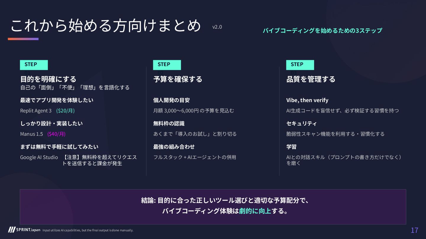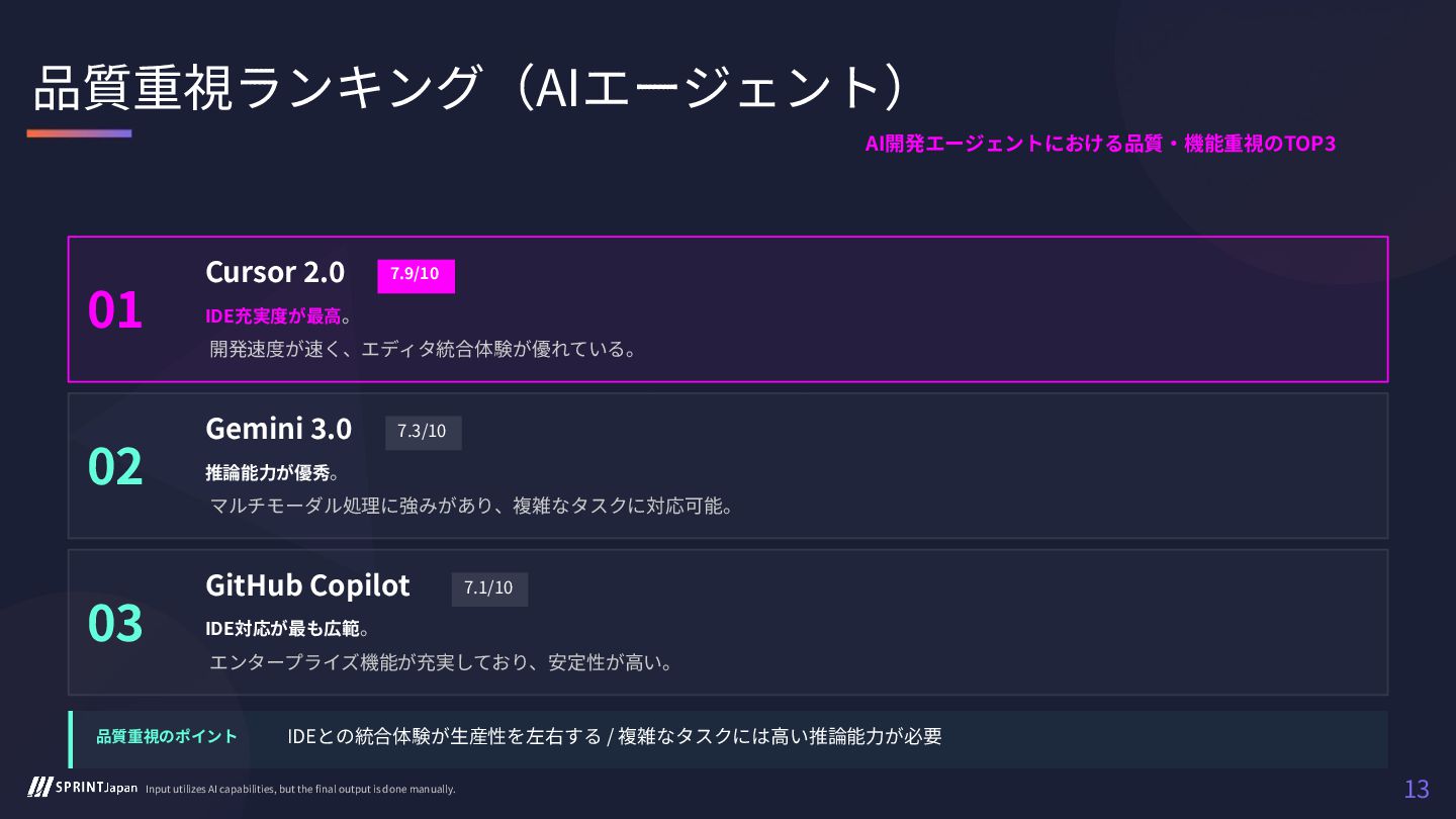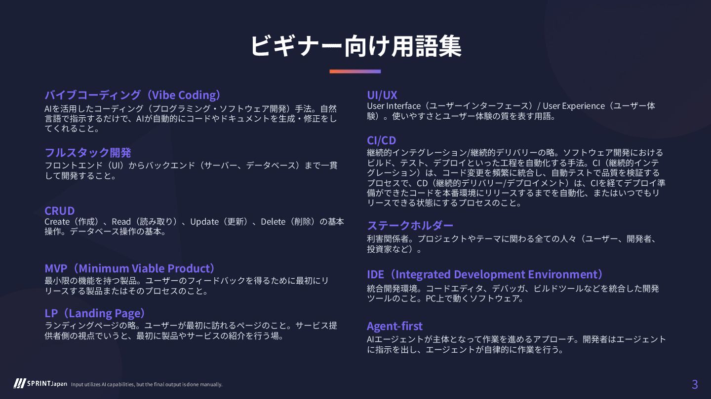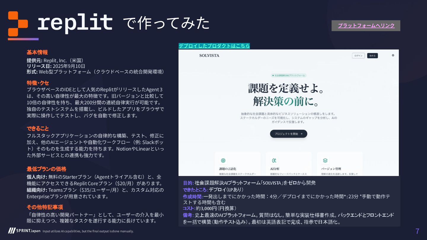 done manually. バイブコーディングプラットフォーム全プロダクト⼀覧 調査対象全18製品の分類‧実質費⽤‧特徴まとめ フルスタックWebアプリ構築 (6製品) プロダクト 実質費⽤ 主な特徴 Replit Agent 3 $20/⽉ 開発速度最速(4分)、動作テスト優秀 Manus 1.5 $40/⽉ 要件定義書‧仕様書⾃動⽣成、Notion連携 Lovable $25/⽉ LP⽣成品質最⾼、セキュリティ機能充実 Bolt.new ¥3,000/⽉ CRUD機能に強み、⾼速開発 v0 (Vercel) ¥3,000/⽉ UIコンポーネント⽣成特化、プレビュー最速 Emergent $20/⽉ ⾮技術者向け、会話でアプリ変換 Google AI Studio ¥1,500/⽉ 無料枠を超えてリクエストを送信すると課⾦ が発⽣ Google Antigravity 無料 完全無料だが開発サーバー不安定 Figma Make ¥3,300/⽉ UI/UX実装‧CRUD機能も実装可能 AI開発エージェント (12製品) プロダクト 実質費⽤ 主な特徴 Cursor 2.0 $20/⽉ Composer1が⾼速‧コード⽣成全体のバランス GitHub Copilot $10/⽉ IDE対応最広範、エンタープライズ向け Gemini 3.0 ¥1,500/⽉ 推論能⼒優秀、マルチモーダル処理 ChatGPT 5.1 ¥3,000/⽉ 仕様書作成に特化、実装機能なし Claude Code ¥3,000/⽉ ー未実施(次号予定)ー Claude Sonnet 4.5 ¥3,000/⽉ 実装ファイル⽣成に強み Codex ¥3,000/⽉ ー未実施(次号予定)ー ParaFlow ¥4,000/⽉ UI/UX設計特化、プロダクトデザインAI KIRO 無料 要件定義‧仕様書作成‧タスク管理が最も詳 細‧丁寧 Devin $20/⽉ 技術者向け、アプリ開発だけでは⼒を発揮し きれてない模様