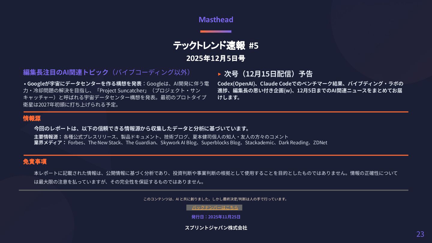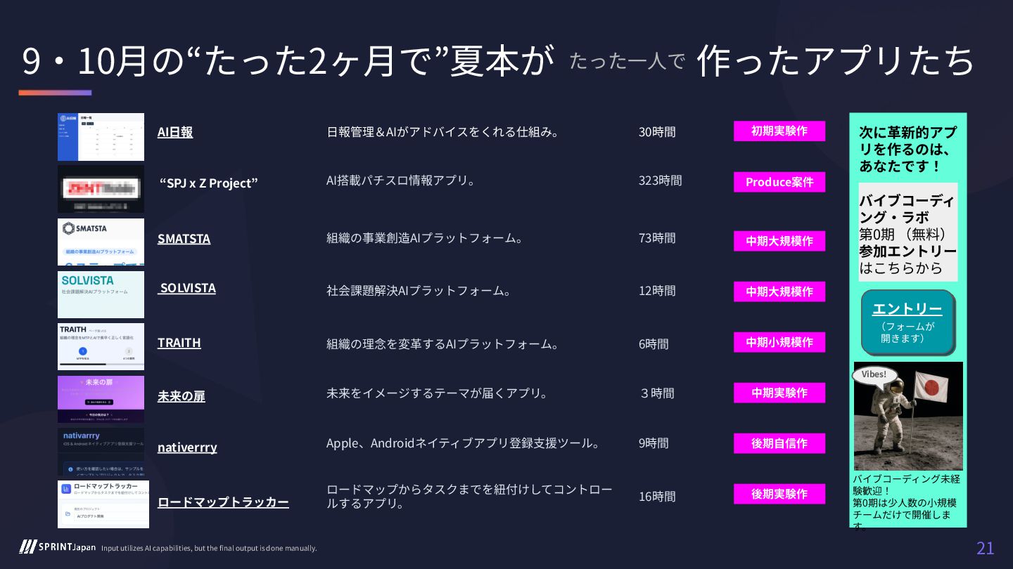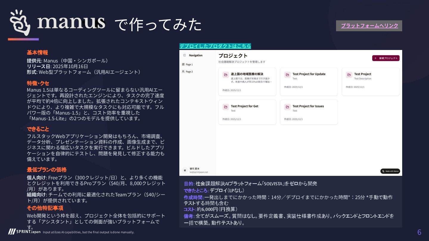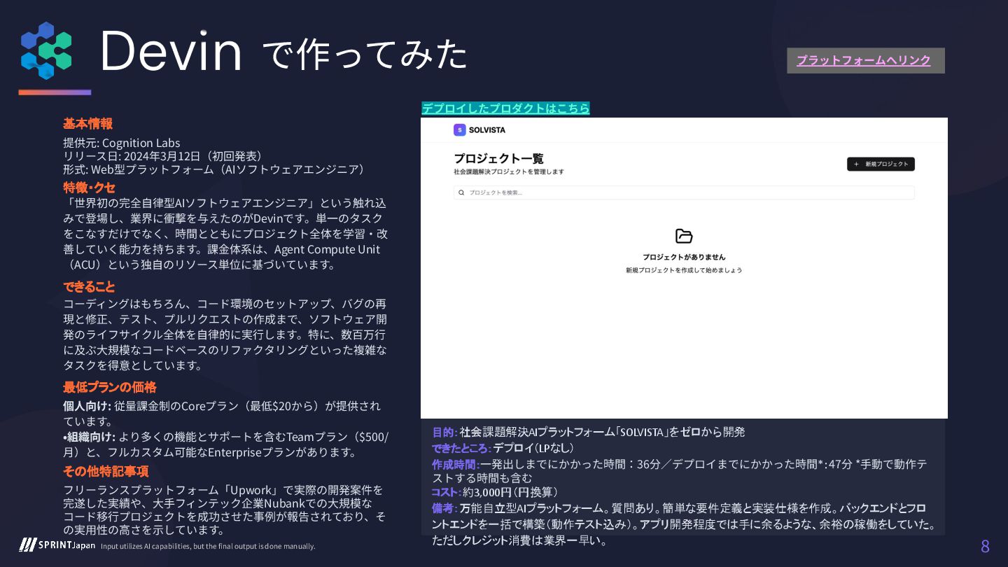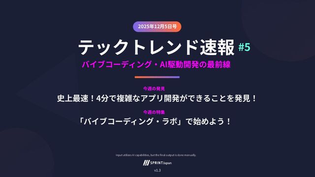 done manually. バイブコーディングプラットフォーム全プロダクト⼀覧 調査対象全18製品の分類‧実質費⽤‧特徴まとめ フルスタックWebアプリ構築 (6製品) プロダクト 実質費⽤ 主な特徴 Replit Agent 3 $20/⽉ 開発速度最速(4分)、動作テスト優秀 Manus 1.5 $40/⽉ 要件定義書‧仕様書⾃動⽣成、Notion連携 Lovable $25/⽉ LP⽣成品質最⾼、セキュリティ機能充実 Bolt.new ¥3,000/⽉ CRUD機能に強み、⾼速開発 v0 (Vercel) ¥3,000/⽉ UIコンポーネント⽣成特化、プレビュー最速 Emergent $20/⽉ ⾮技術者向け、会話でアプリ変換 Google AI Studio ¥1,500/⽉ 無料枠を超えてリクエストを送信すると課⾦ が発⽣ Google Antigravity 無料 完全無料だが開発サーバー不安定 Figma Make ¥3,300/⽉ UI/UX実装‧CRUD機能も実装可能 AI開発エージェント (12製品) プロダクト 実質費⽤ 主な特徴 Cursor 2.0 $20/⽉ Composer1が⾼速‧コード⽣成全体のバランス GitHub Copilot $10/⽉ IDE対応最広範、エンタープライズ向け Gemini 3.0 ¥1,500/⽉ 推論能⼒優秀、マルチモーダル処理 ChatGPT 5.1 ¥3,000/⽉ 仕様書作成に特化、実装機能なし Claude Code ¥3,000/⽉ ー未実施(次号予定)ー Claude Sonnet 4.5 ¥3,000/⽉ 実装ファイル⽣成に強み Codex ¥3,000/⽉ ー未実施(次号予定)ー ParaFlow ¥4,000/⽉ UI/UX設計特化、プロダクトデザインAI KIRO 無料 要件定義‧仕様書作成‧タスク管理が最も詳 細‧丁寧 Devin $20/⽉ 技術者向け、アプリ開発だけでは⼒を発揮し きれてない模様