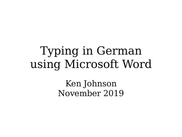 This presentation describes what you have to do before you can type in the German language on Microsoft Word. This presentation has 21 slides which will take about 45 minutes to present. The slides cover turning the spell checking off, installing the Fraktur fonts if you want them, and typing the accented letters and the German double-s.