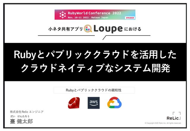 • FirebaseAnalytics/BigQuery連携 • GCP SDK (データ分析基盤と連携) 実⾏基盤 • サーバーのスケーラビリティ • バッチ処理基盤 • ServerlessApplicationの構築 • Puma + Fargate • Fargate + EventBridge + Rakeタスク • AWS Serverless Application Modelと の連携 • 今回ご紹介するRubyとパブリッククラウド連携の事例整理 Ruby / パブリッククラウド連携の分類