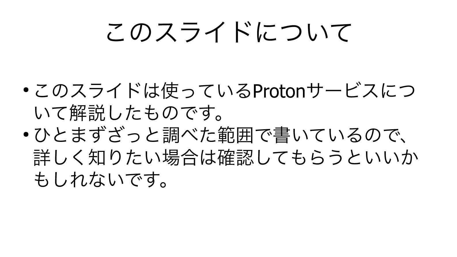 このスライドについて • このスライドは使っているProtonサービスにつ いて解説したものです。 • ひとまずざっと調べた範囲で書いているので、 詳しく知りたい場合は確認してもらうといいか もしれないです。