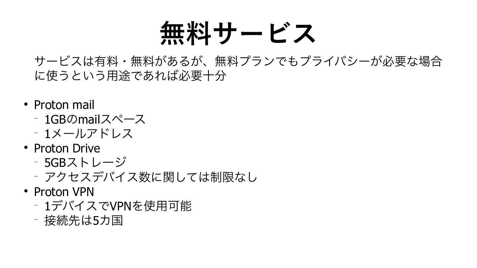 無料サービス サービスは有料・無料があるが、無料プランでもプライバシーが必要な場合 に使うという用途であれば必要十分 • Proton mail ─ 1GBのmailスペース ─ 1メールアドレス