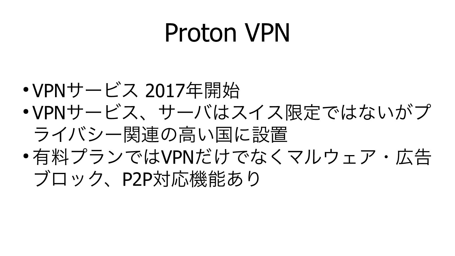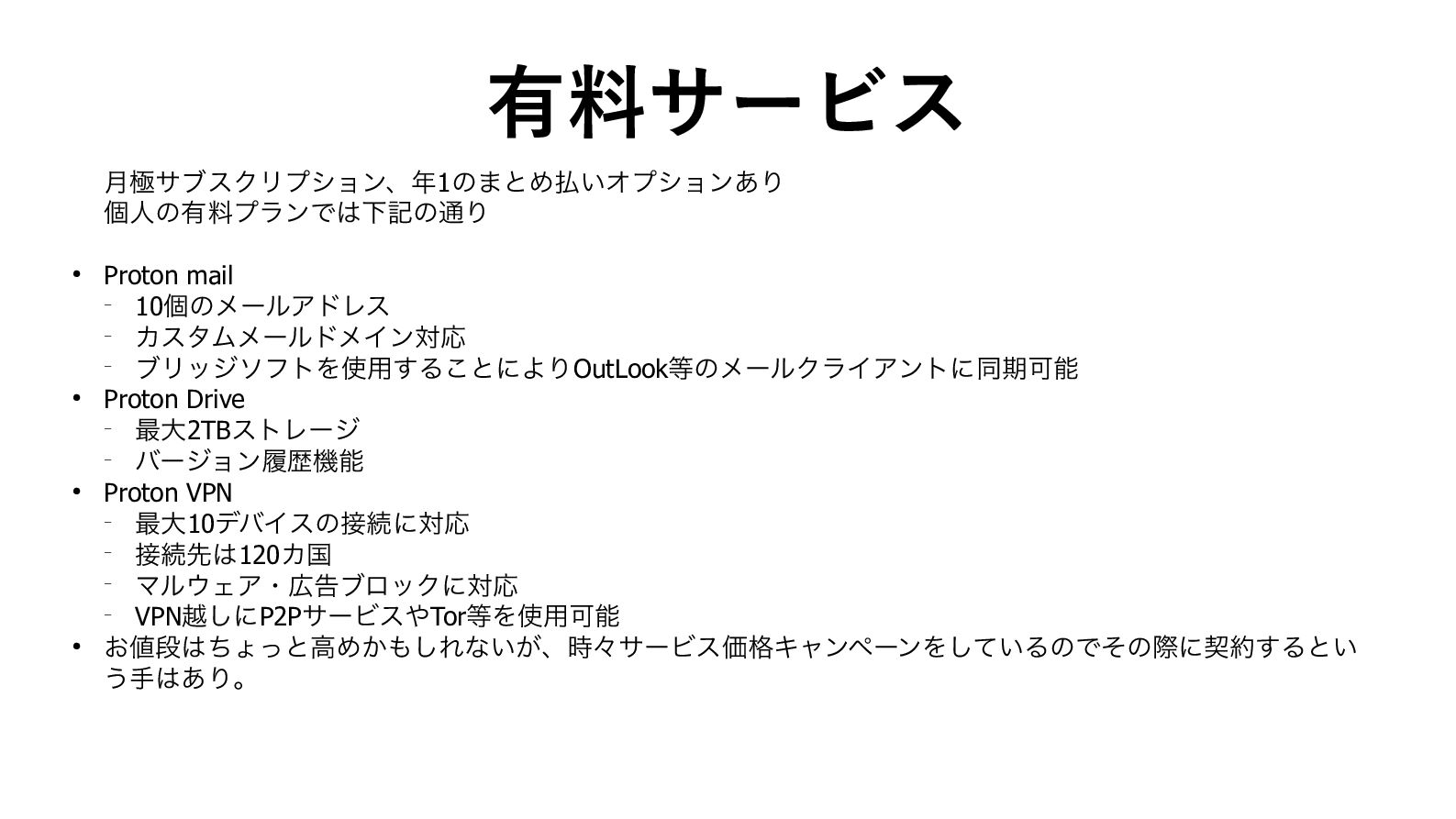─ ブリッジソフトを使用することによりOutLook等のメールクライアントに同期可能 • Proton Drive ─ 最大2TBストレージ ─ バージョン履歴機能 • Proton VPN ─ 最大10デバイスの接続に対応 ─ 接続先は120カ国 ─ マルウェア・広告ブロックに対応 ─ VPN越しにP2PサービスやTor等を使用可能 • お値段はちょっと高めかもしれないが、時々サービス価格キャンペーンをしているのでその際に契約するとい う手はあり。