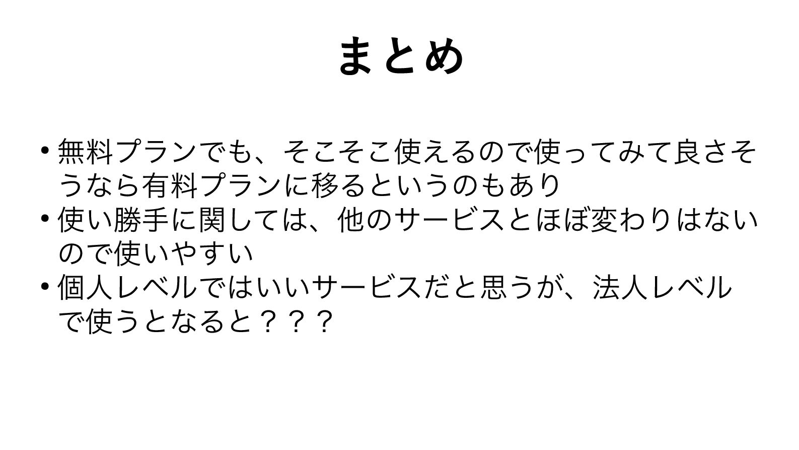 まとめ • 無料プランでも、そこそこ使えるので使ってみて良さそ うなら有料プランに移るというのもあり • 使い勝手に関しては、他のサービスとほぼ変わりはない ので使いやすい • 個人レベルではいいサービスだと思うが、法人レベル で使うとなると???