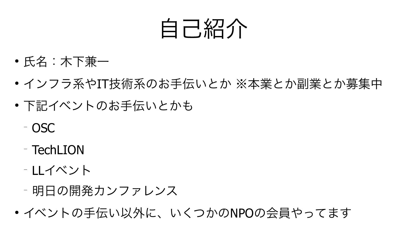 自己紹介 • 氏名:木下兼一 • インフラ系やIT 技術系のお手伝いとか ※本業とか副業とか募集中 • 下記イベントのお手伝いとかも ─