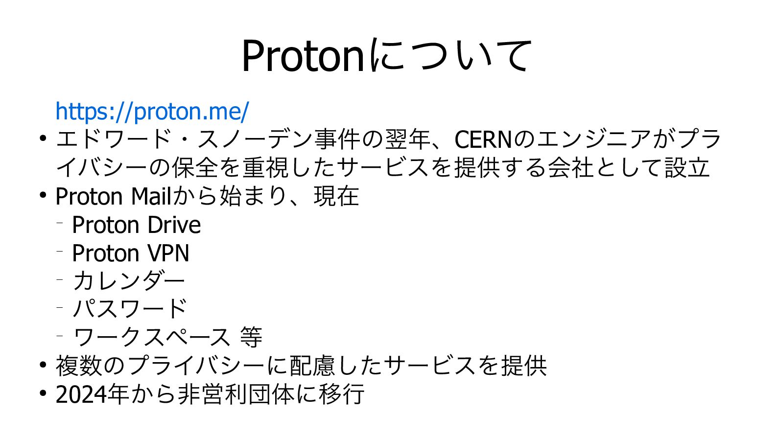 Protonについて https://proton.me/ • エドワード・スノーデン事件の翌年、CERNのエンジニアがプラ イバシーの保全を重視したサービスを提供する会社として設立 • Proton Mailから始まり、現在 ─ Proton