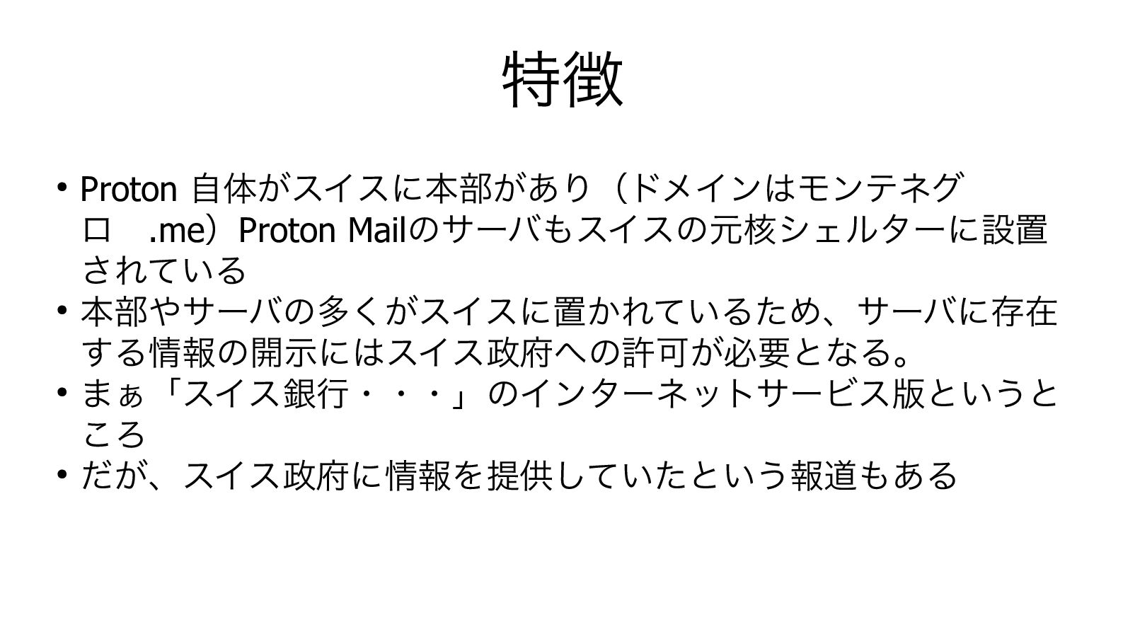 特徴 • Proton 自体がスイスに本部があり(ドメインはモンテネグ ロ .me)Proton Mailのサーバもスイスの元核シェルターに設置 されている •