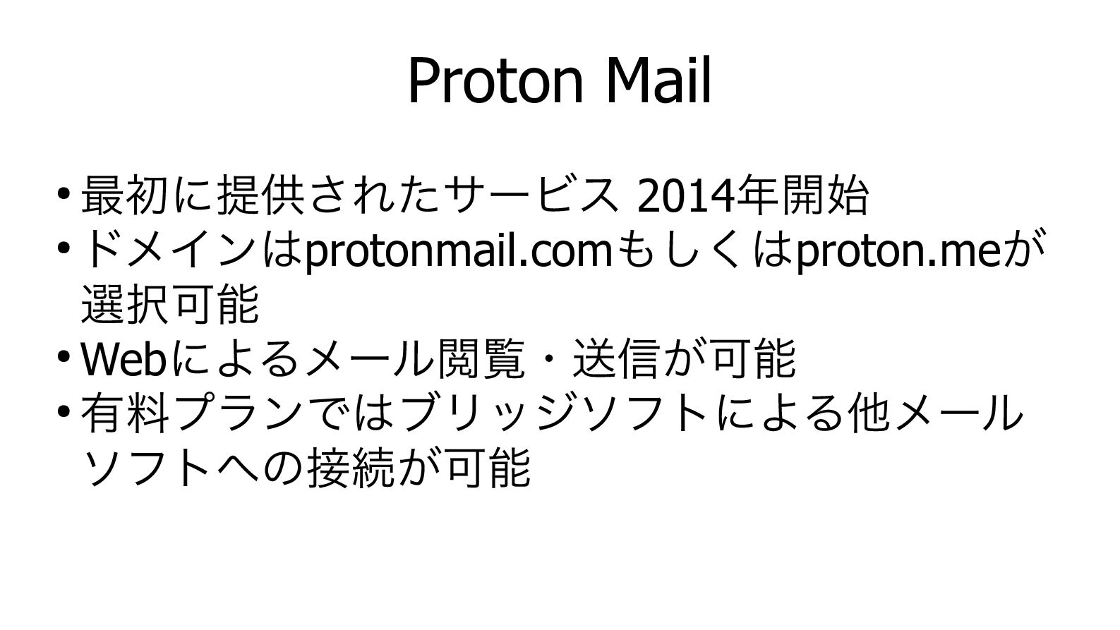 Proton Mail • 最初に提供されたサービス 2014年開始 • ドメインはprotonmail.comもしくはproton.meが 選択可能 • Webによるメール閲覧・送信が可能