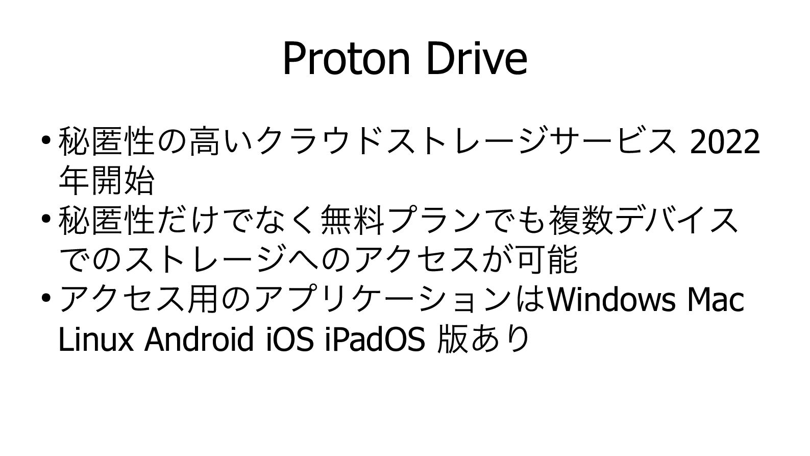 Proton Drive • 秘匿性の高いクラウドストレージサービス 2022 年開始 • 秘匿性だけでなく無料プランでも複数デバイス でのストレージへのアクセスが可能 •
