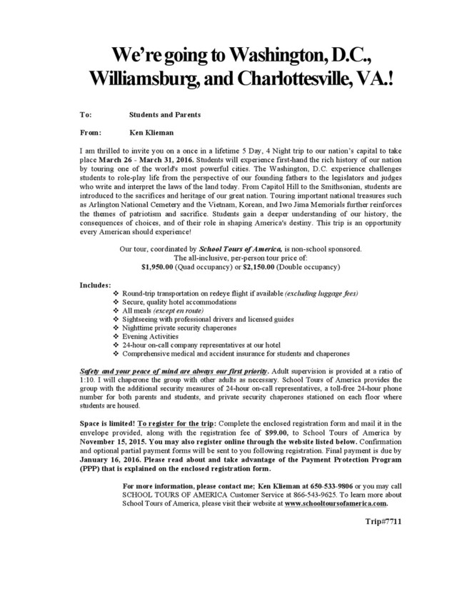 • Fax: (713) 973-1223 5 Cancellation by Registrant Not Participating in the Payment Protection Program: If the registrant is not participating in the Payment Protection Program, there are charges associated with cancellation. All notices of cancellation must be in writing and fees for cancellation will be based on the post office postmark (no metered mail please). Money is refunded to the original payer. Cancellation Charges Per Registrant: Cancellation MORE than 65 days prior to departure……………………………………………………………………………………………………………………...Registration payment Cancellation 46-65 days prior to departure………………………………………………………………………………………………………………………………...45% of trip cost Cancellation LESS than 46 days prior to departure…………………………………………………………………..……….………………………………..….……..85% of trip cost Cancellation Due To Rescheduling: In the event the Tour Director chooses to change the departure date, the standard cancellation charges remain effective for the original departure date. Cancellation by School Tours of America: STA reserves the right to cancel any tour at its sole discretion and for any reason. If a tour is cancelled by STA, all funds collected from any registrant will be promptly refunded in full. Money is refunded to the original payer. Cancellation of a tour by Tour Director, School, or School Administration without the consent of STA is subject to standard cancellation charges. Non-Responsibility: School Tours of America, LLC (STA), and its employees, agents, and representatives use third part suppliers to arrange tours, transportation, sightseeing, hotel, and all other services related to this tour. STA is an independent contractor and is not an employee, agent, or representative of any of these suppliers. STA does not own, manage, operate, supervise, or control any transportation, vehicle, airplane, hotel or restaurant, or any other entity that supplies services related to your tour. All suppliers are independent contractors, and are not agents or employees or representatives of STA. 1) STA assumes no responsibility or liability for any delay, change in schedule, loss, injury or damage or loss of any participant that may result from any act or omission on the part of others; and 2) STA shall be relieved of any obligations under these terms and conditions in the event of any strike, labor dispute, act of God, or of government, fire, war, whether declared or not, terrorism, insurrection, riot, theft, pilferage, epidemic, illness, physical injury, quarantine, medical or customs or immigration regulation, delay, or cancellation. All tickets, receipts, coupons, and vouchers are issued subject to the terms and conditions specified by each supplier, and by accepting the coupons, vouchers, and tickets, or utilizing the services, all customers agree that neither STA, nor its employees, agents, or representatives are or may be liable for any loss, injury, or damage to any tour participant or their belongings, or otherwise, in connection with any service supplied or not supplied resulting directly or indirectly from any occurrence beyond the control of STA. To the maximum extent allowed under applicable law participants waive any and all claims against STA. STA reserves the right to refuse to accept or retain any person as a tour participant and to expel the same from the tour for their return home in the event of misconduct or incompatibility with the interest of the group, as determined by your Tour Director, STA or STA representative’s sole discretion. Forum Selection: Subject to the Arbitration provision below, participants consent to the exclusive jurisdiction of the courts of Harris County, Texas, in any litigation concerning, arising out of, or related to the trip, including airfare and accommodations and any and all other services booked through STA. Actions may be brought only within Harris County, Texas State and Federal courts, as appropriate, and no where else (unless such courts cannot establish jurisdiction over the parties), and Texas law will be applicable to any and all such litigation, without regard to its conflict of laws provisions. The prevailing party in any such litigation will be entitled to reasonable attorneys' fees and costs. Binding Agreement to Arbitrate: Upon demand of any party, whether made before or after the institution of any judicial proceeding, any claim or controversy concerning, arising out of, or related to the trip, including airfare and accommodations and any and all other services booked through STA, shall be settled by binding arbitration in Harris County, Texas, in accordance with the Commercial Arbitration Rules of the American Arbitration Association, and any judgment upon the award rendered by the arbitrator(s) may be entered in any court of Harris County, Texas having jurisdiction thereof. Brochure Printing Disclaimer: STA is not responsible for any typographic or printing error in any brochure, itinerary, confirmation, or related material. Severability: If any provision of these terms and conditions shall be held unenforceable, such provision shall be struck and the remainder shall remain enforceable. California Only: CST 2065169-40. Registration as a seller of travel does not constitute approval by the State of California. STA does not have a location in California and therefore does not participate in the California Travel Consumer Restitution Corporation. California law requires certain sellers of travel to have a trust account or bond. STA has established a trust account. Upon cancellation of the transportation of travel services where you, the customer, are not at fault and have not canceled in violation of the terms and conditions, if any, of the contract for transportation and
